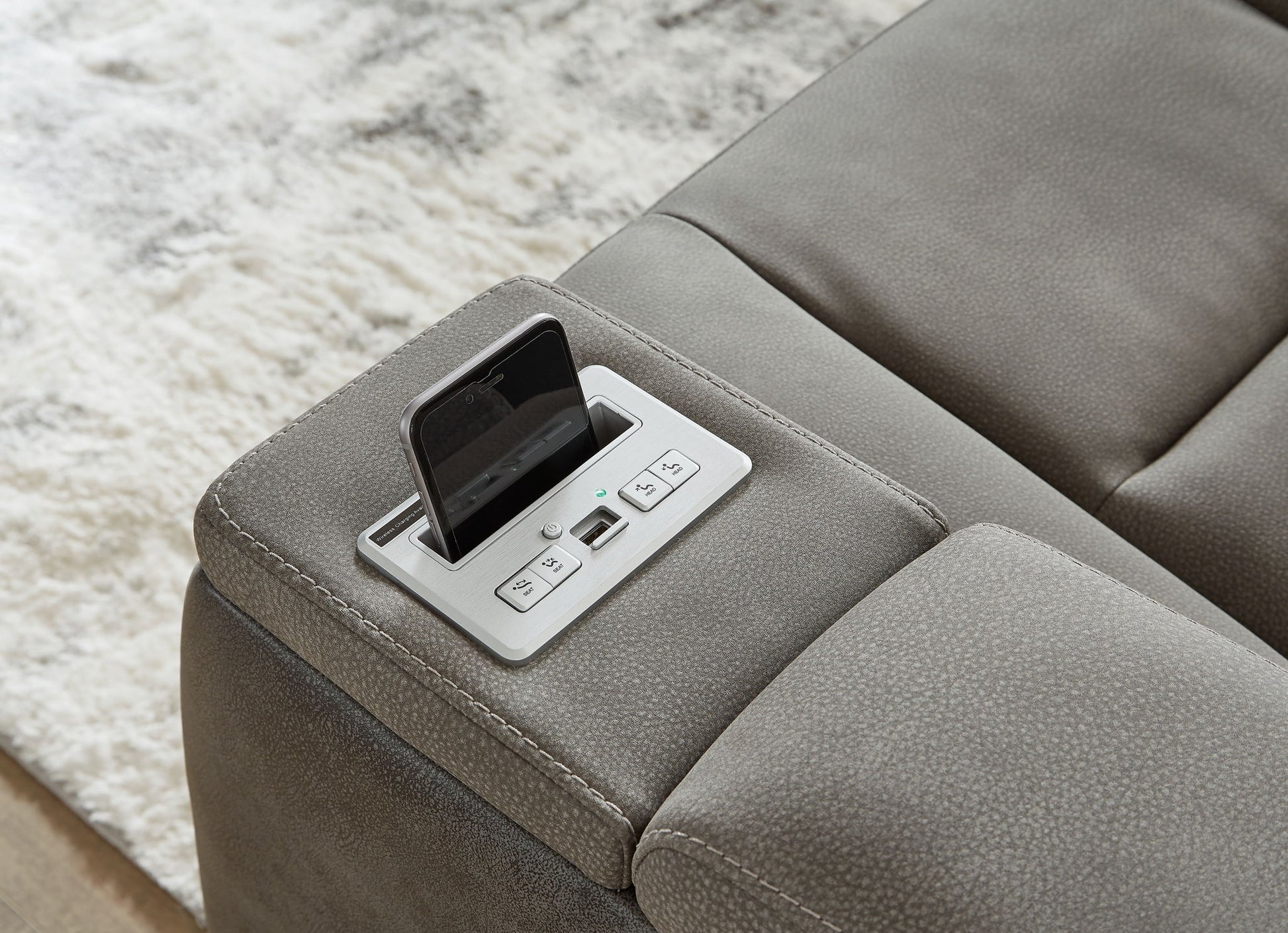 Sleek, ultra-modern power reclining sofa. Two-tone Durapella upholstery is more durable and water-repellent than regular leather. Includes drop-down table, wireless and USB charging, adjustable headrest and extended "zero-gravity" ottoman.