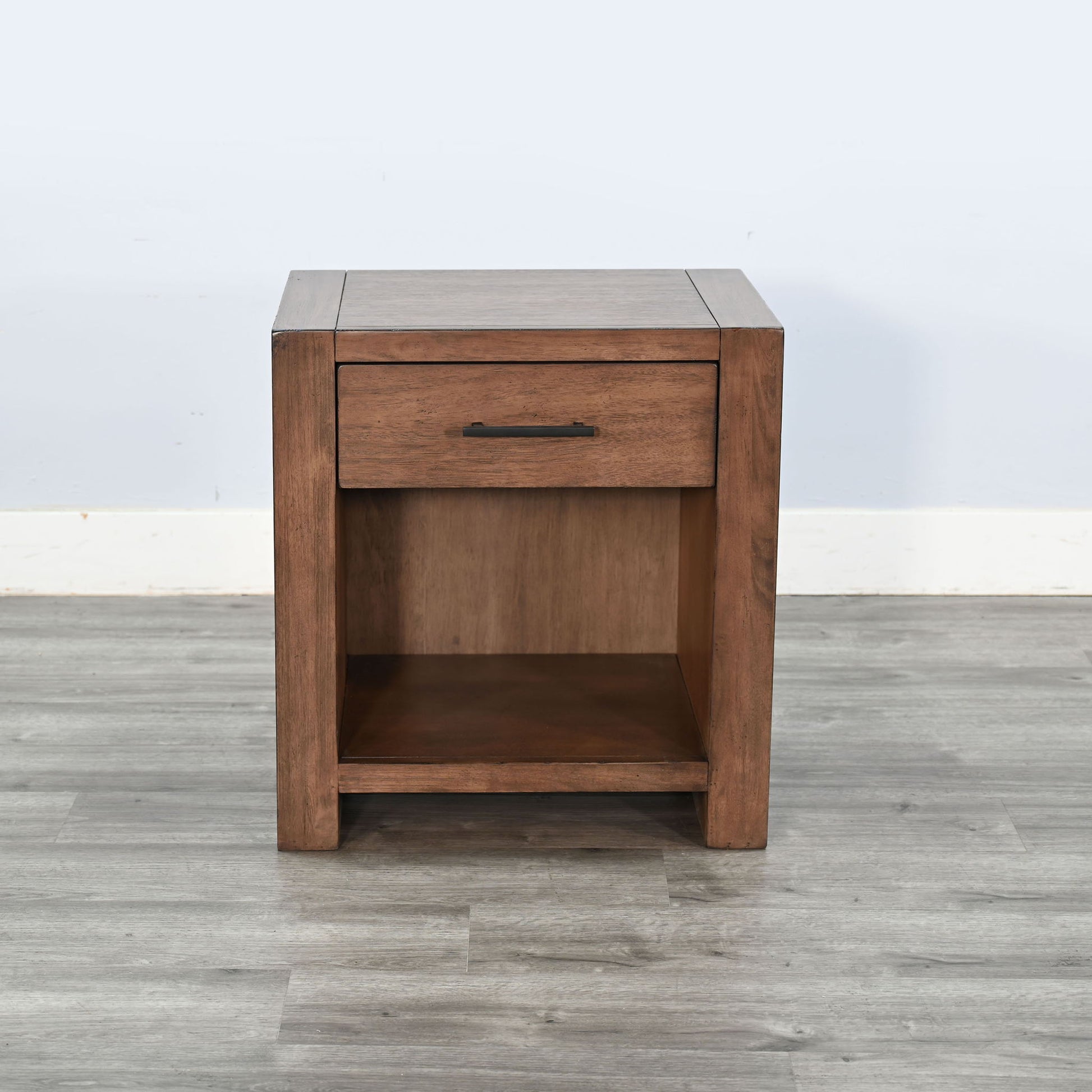 Enhance your bedside space with this Modern Nightstand, featuring a sleek design and a warm walnut finish. The nightstand includes a spacious drawer with sleek black metal hardware for concealed storage and an open shelf for displaying books, décor, or other essentials. Built with durable materials, this nightstand combines style and functionality, making it the perfect addition to modern or transitional bedrooms.