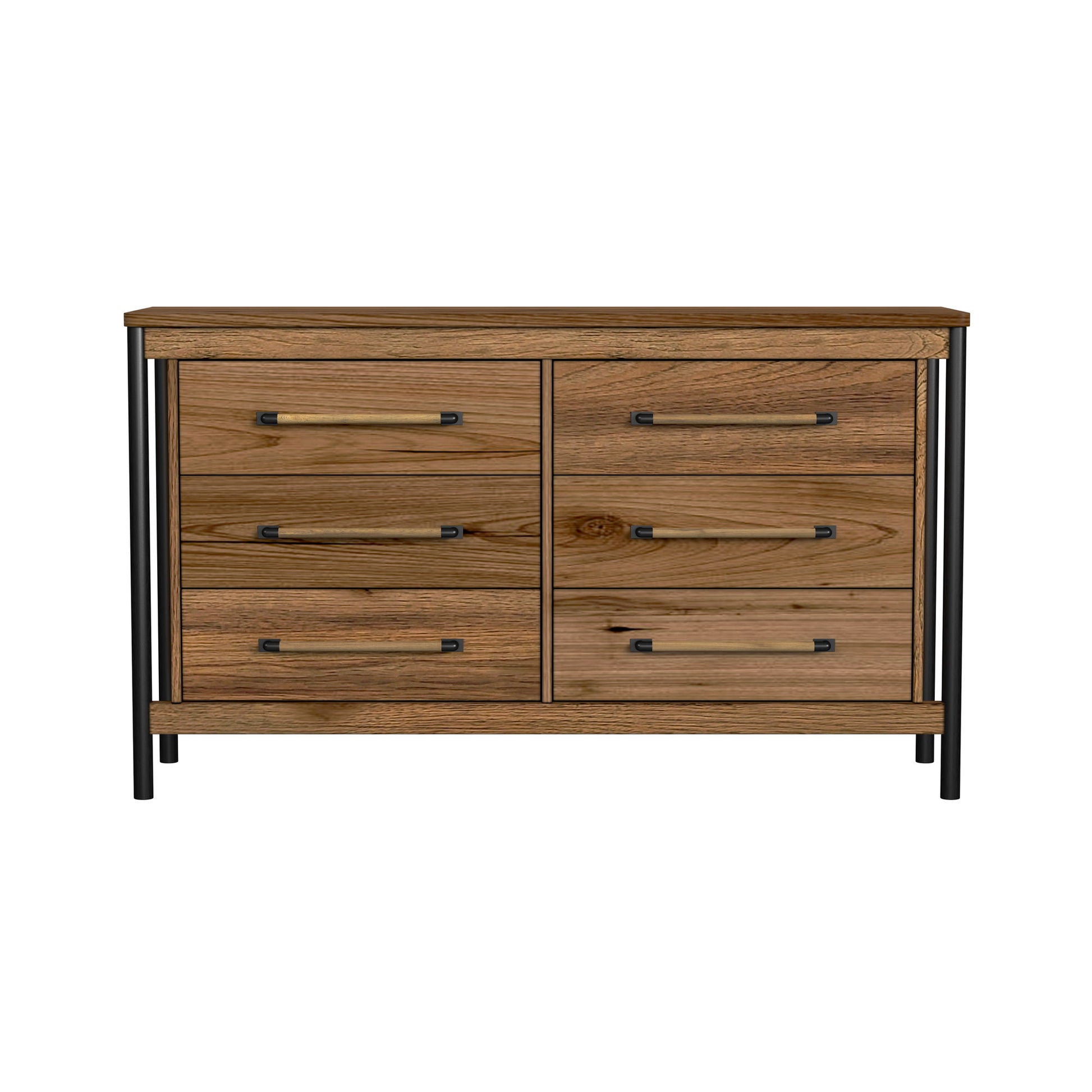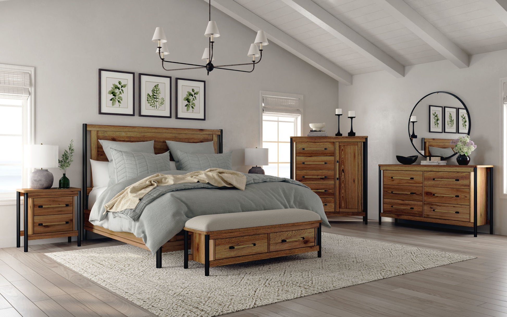 The Industrial Modern style of the Norcross Bedroom group blends the natural beauty of its rustic veneer with its clean lines and abundant metal accents throughout. This bedroom collection features custom designed wood and metal hardware and is finished in a warm and inviting hickory finish.