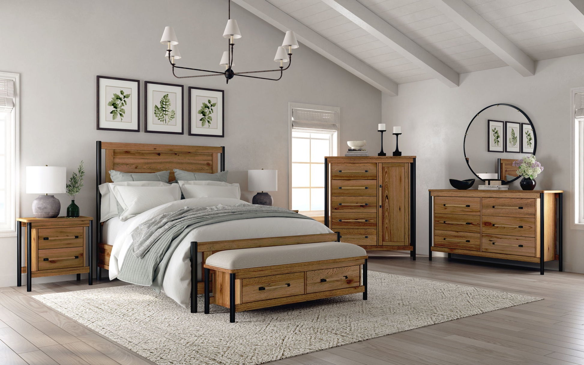 The Industrial Modern style of the Norcross Bedroom group blends the natural beauty of its rustic veneer with its clean lines and abundant metal accents throughout. This bedroom collection features custom designed wood and metal hardware and is finished in a warm and inviting hickory finish.