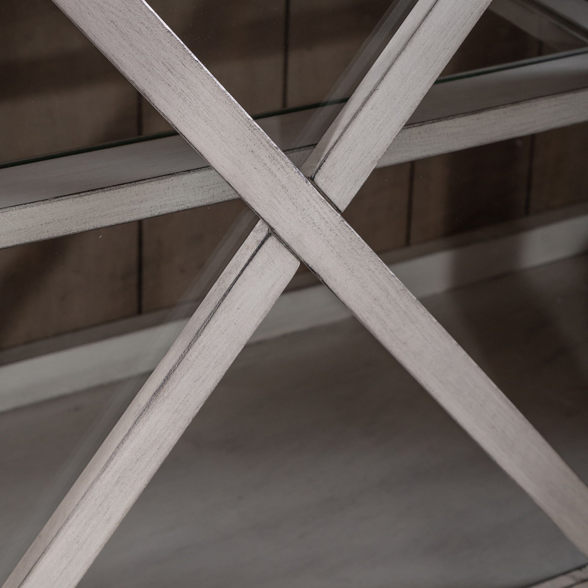Crafted of rubberwood solids with pine veneers in antique white and weathered pine finish. Features two sliding doors with “X” grid overlay, planked back panel, a wood framed adjustable glass shelf and interior lighting. Cannot stand alone. Pair with the buffet for a complete set.