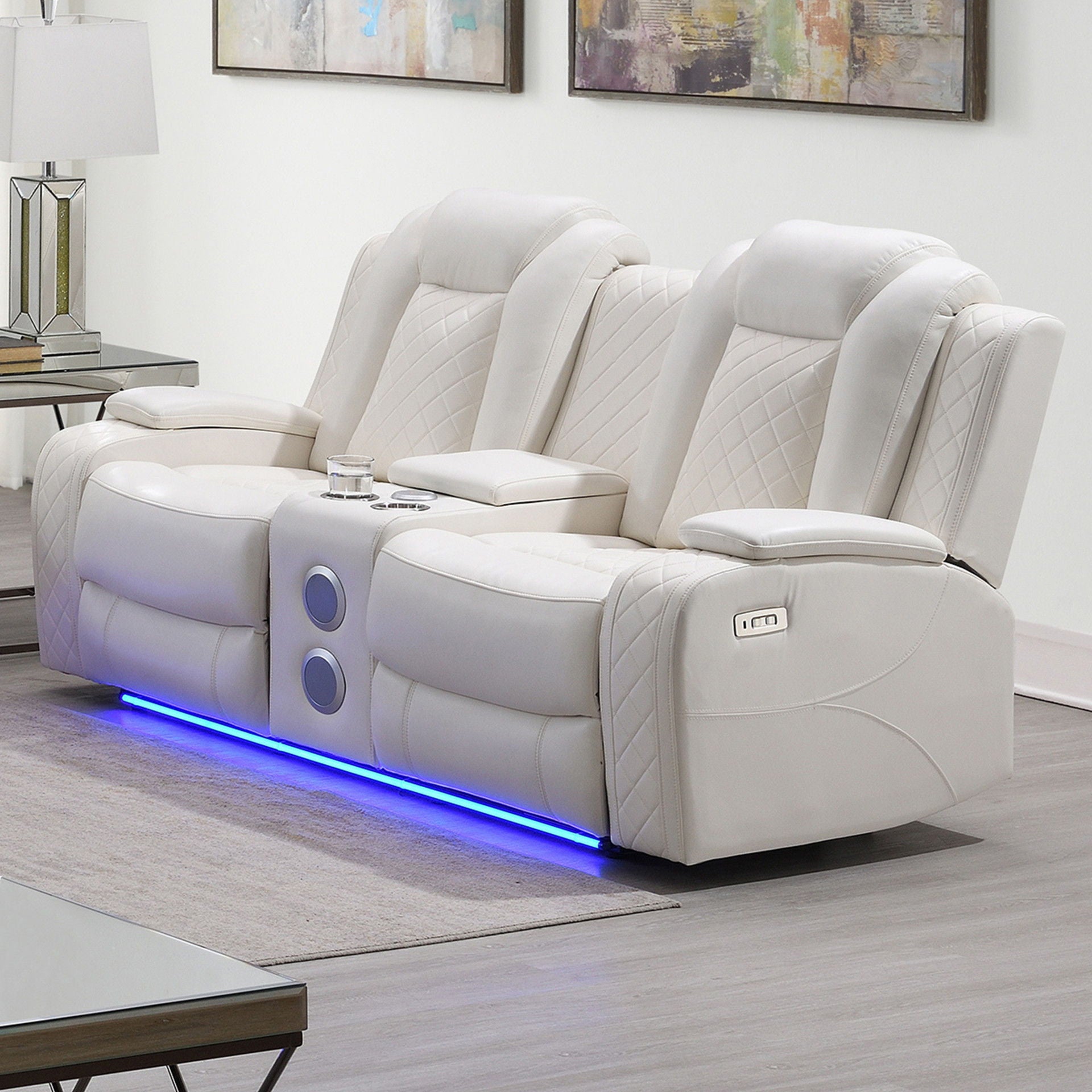 Meet the Orion Console Loveseat, a marvel of durability and comfort designed to elevate your relaxation experience. Crafted with a blend of hardwoods and manufactured wood, its sturdy construction ensures long-lasting strength. Sink into the soft, breathable upholstery, a luxurious blend of polyester and PU, for a supple feel and cozy seating. Experience smooth reclining action thanks to top-quality mechanisms, while high-density foam and pocket coil cushions wrapped in Dacron offer unparalleled support. Expert tailoring, including white contrast stitching and a distinctive diamond pattern, adds a touch of sophistication to its sleek design. Lift up the pillowed arms to reveal convenient storage compartments and silver drink holders. Complete with theater lighting, Bluetooth speakers, wireless charging pad, and USB ports, this loveseat brings the movie theater experience to your living room. Upgrade your comfort with the Orion Console Loveseat today.
