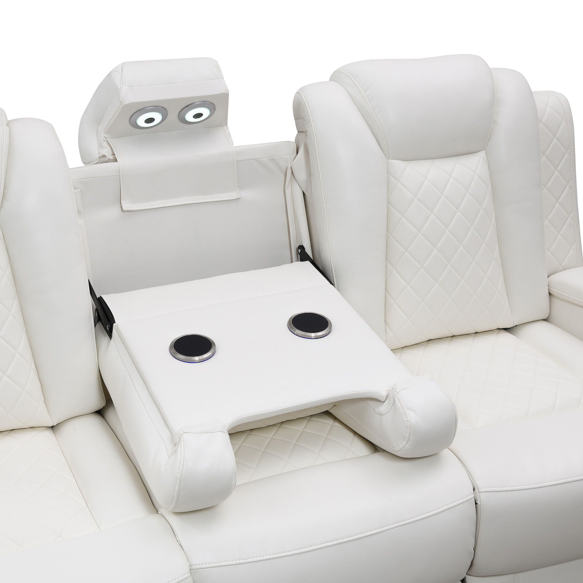 Experience the epitome of comfort and style with the Orion Sofa. Crafted with a blend of hardwoods and manufactured wood, its durable frame ensures long-lasting strength. Sink into the soft embrace of its upholstery, a blend of polyester and PU for a luxuriously supple feel. Thanks to top-quality reclining mechanisms, relaxation is effortless as you lean back into plush seating supported by high-density foam and pocket coil cushions wrapped in Dacron. Expert tailoring is evident in the sleek design, accentuated by white contrast stitching and a distinctive diamond pattern on seats and arms. Lift up pillowed arms reveal convenient storage compartments, while theater lighting along the base and reading lamps under the center headrest create the perfect ambiance. With a drop-down center back cushion housing wireless charging pads and USB charging ports, convenience meets contemporary elegance in the Orion Sofa