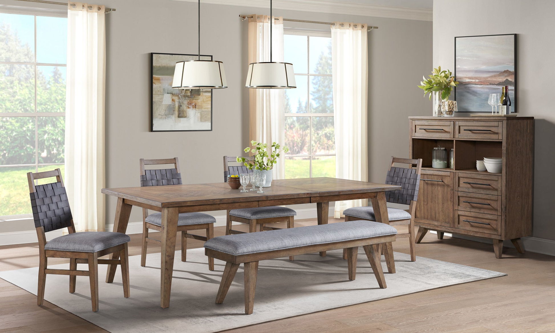 The Oslo Dining Collection is constructed with wire brushed oak veneer and offered in a Weathered Chestnut finish. Unique features of this collection are the patterned veneer table and sideboard tops, woven bonded leather strap chair backs with bronze nail accents, and large bar pull hardware with a dark bronze finish.
