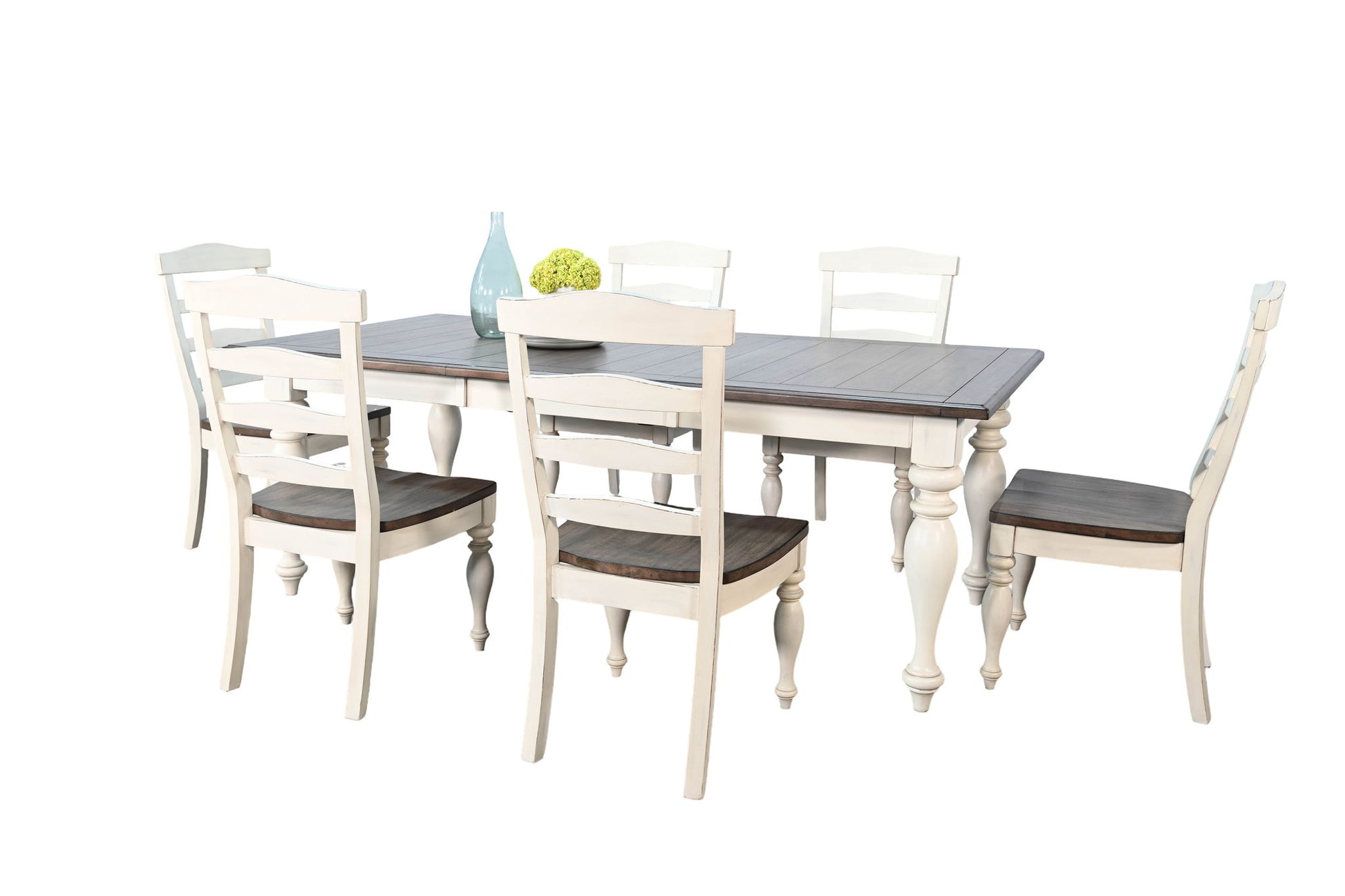 Bring timeless charm and warmth to your dining space with this farmhouse-style dining set. Featuring a sturdy rectangular table and marching seating, this set blends rustic elegance with everyday functionality. The table showcases a rich, wood top contrasted by distressed antique white legs, creating a beautifully aged look that complements both modern and traditional interiors. Turned legs add a classic touch, while the spacious tabletop offers ample room for family meals or entertaining guests.