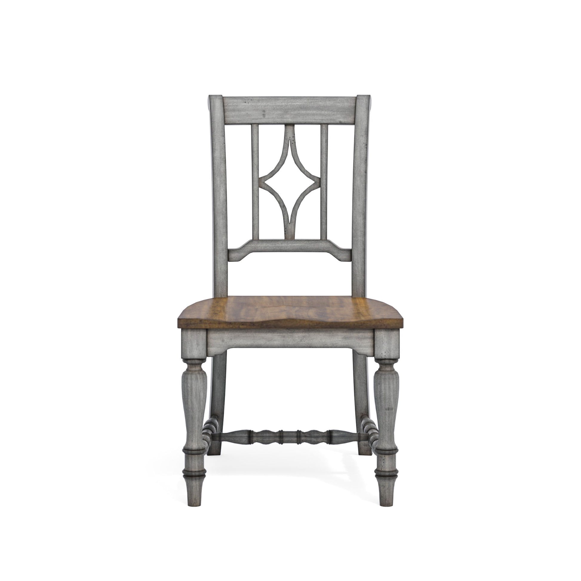 Add cozy charm to mealtimes with the Plymouth dining chair, designed to complement our Plymouth dining tables with a coordinating cottage look. Featuring an appealing open back design with a diamond-shaped detail, intricately carved trestles and turned legs, this chair provides a vintage look that’s full of character. With its weathered graywash finish and contrasting medium brown seat, this chair can be easily mixed and matched with other Plymouth chairs in the collection for a cohesive look.