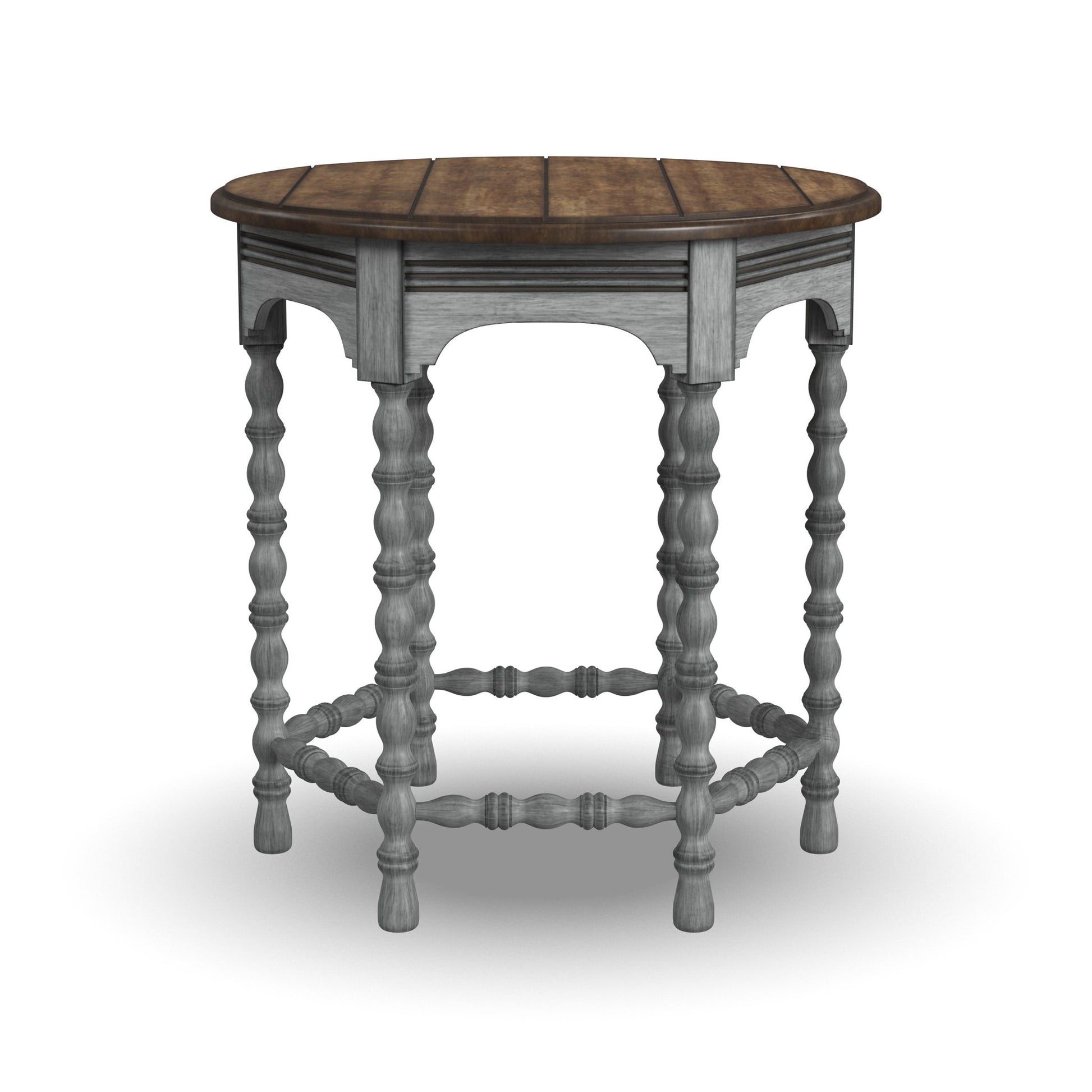 Bring the inviting look of vintage charm to your living spaces with the Plymouth lamp table. Featuring intricately spool-turned legs and trestles, carved accents and a distressed graywash finish with contrasting medium brown top, this table is sure to add warmth and character to your living space.