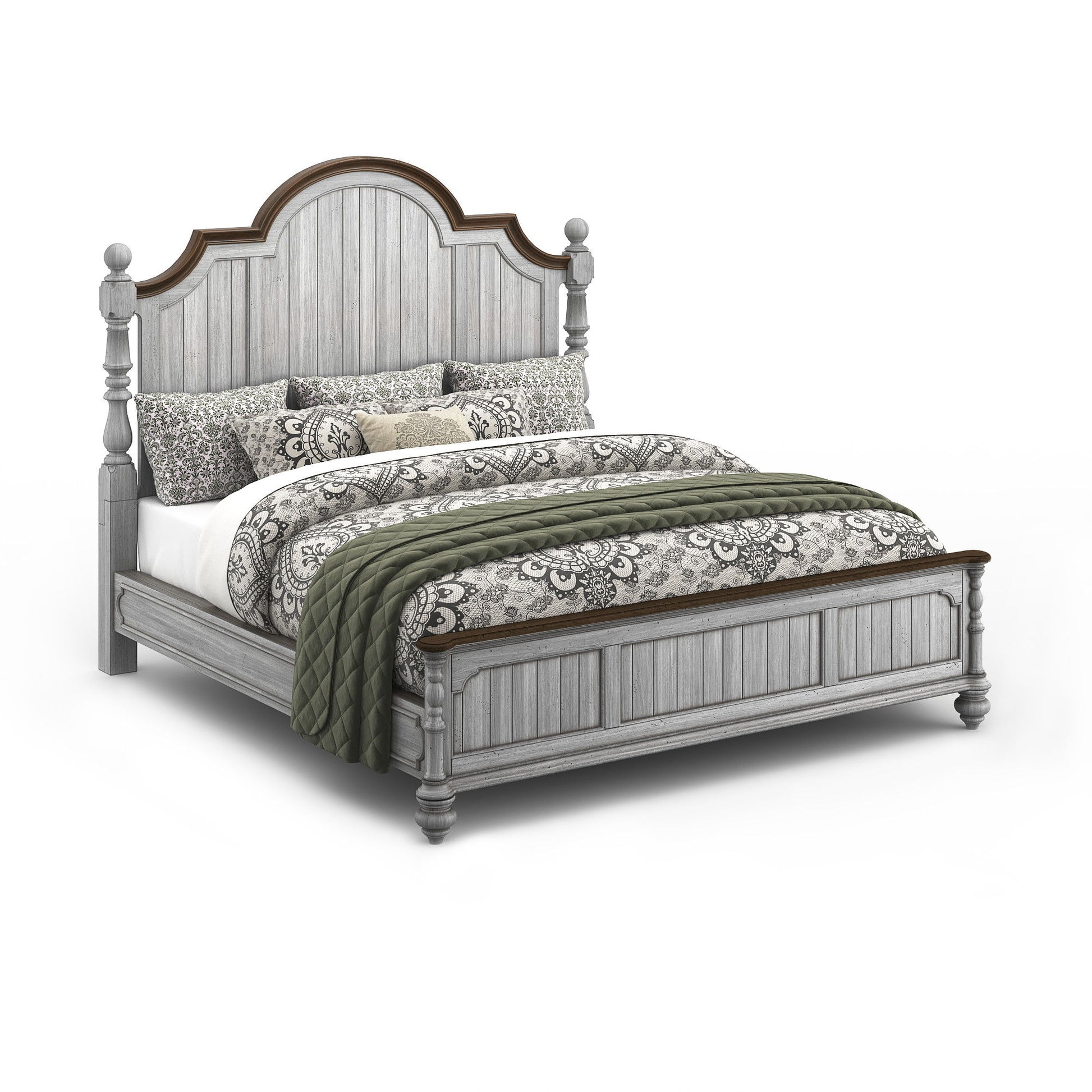 Drift off to sleep in the cozy, cottage-style Plymouth Poster Bed, featuring charming, paneled accents and detailed molding on the headboard and footboard. Available in King size as well as Queen and California King sizes, this bed is crafted with high-quality construction, ensuring it can be enjoyed for generations to come. The graceful, scalloped profile of the headboard and intricately carved posts make this bed a statement piece. Finished in a distressed highlighted by contrasting medium brown accents, the Plymouth poster bed brings warmth and character to any bedroom.