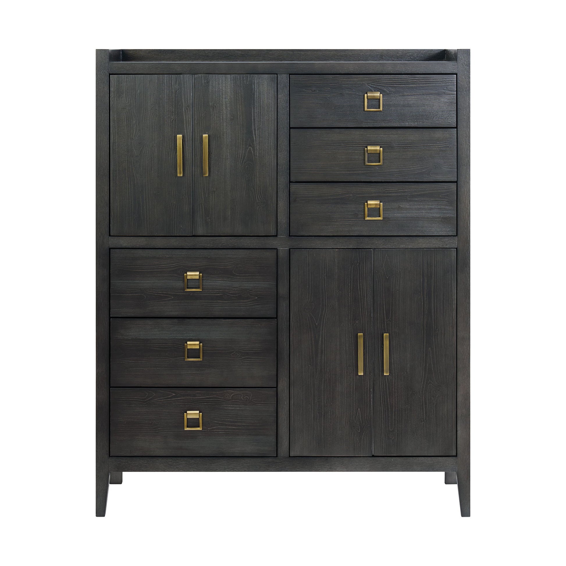 Spruce Veneer and hardwood solids. Contemporary style with heavily wire brushed dark spruce finish with silver undertones. The angular “ring pull” style hardware has an antique gold finish.
