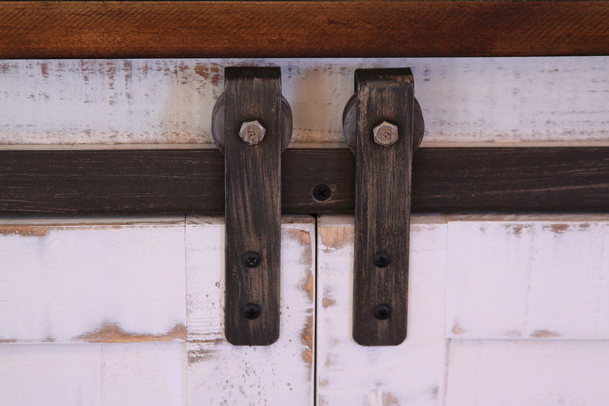 4 Door TV Stand. Introducing our Pueblo White collection, crafted from solid pine wood. This rustic collection is the perfect addition to bring your dream space to life. It features a hand-distressed finish in white and brown on the tops.