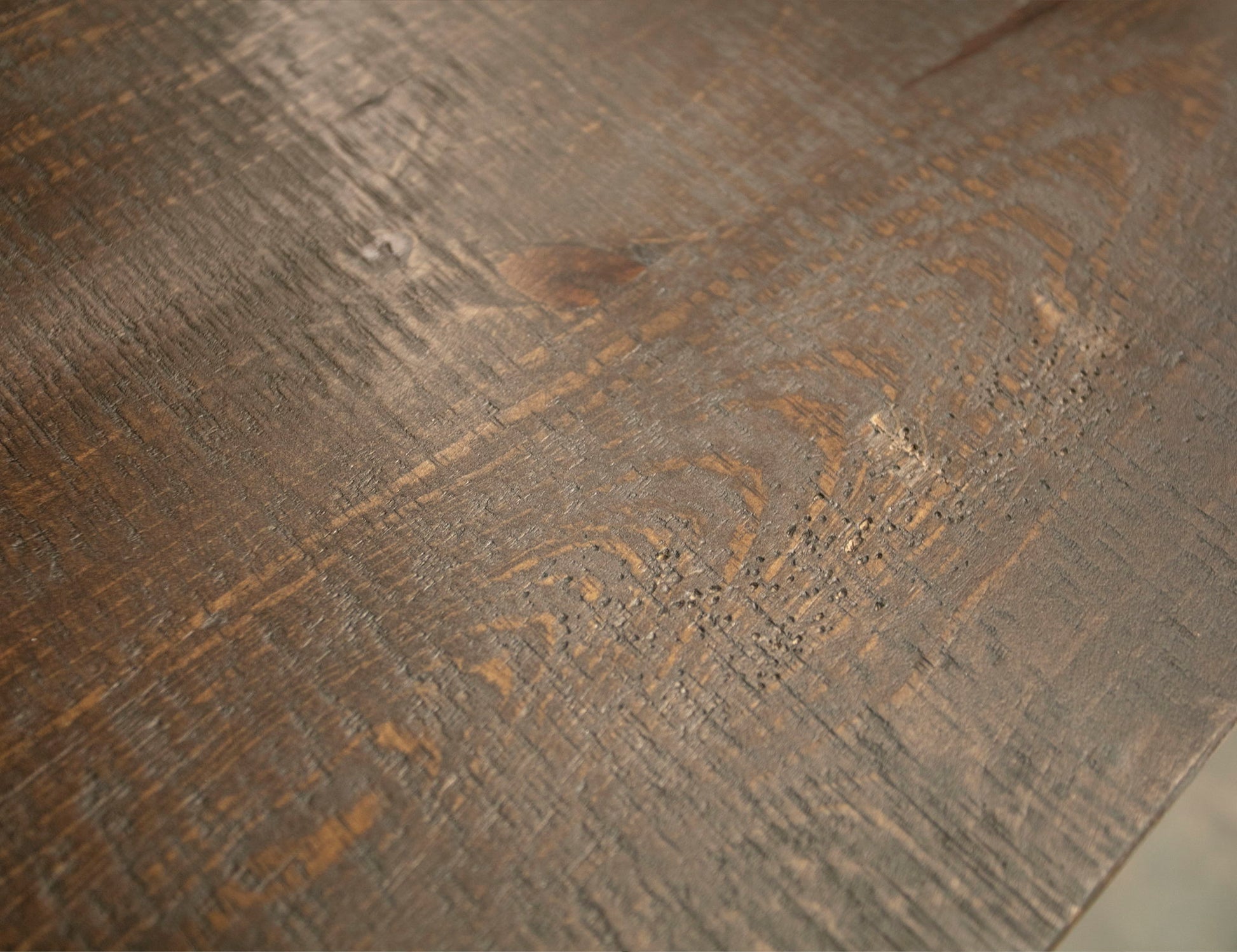 - Two-tone, multi-step lacquer finish with a weathered white effect on hand-distressed wood and brown tops.