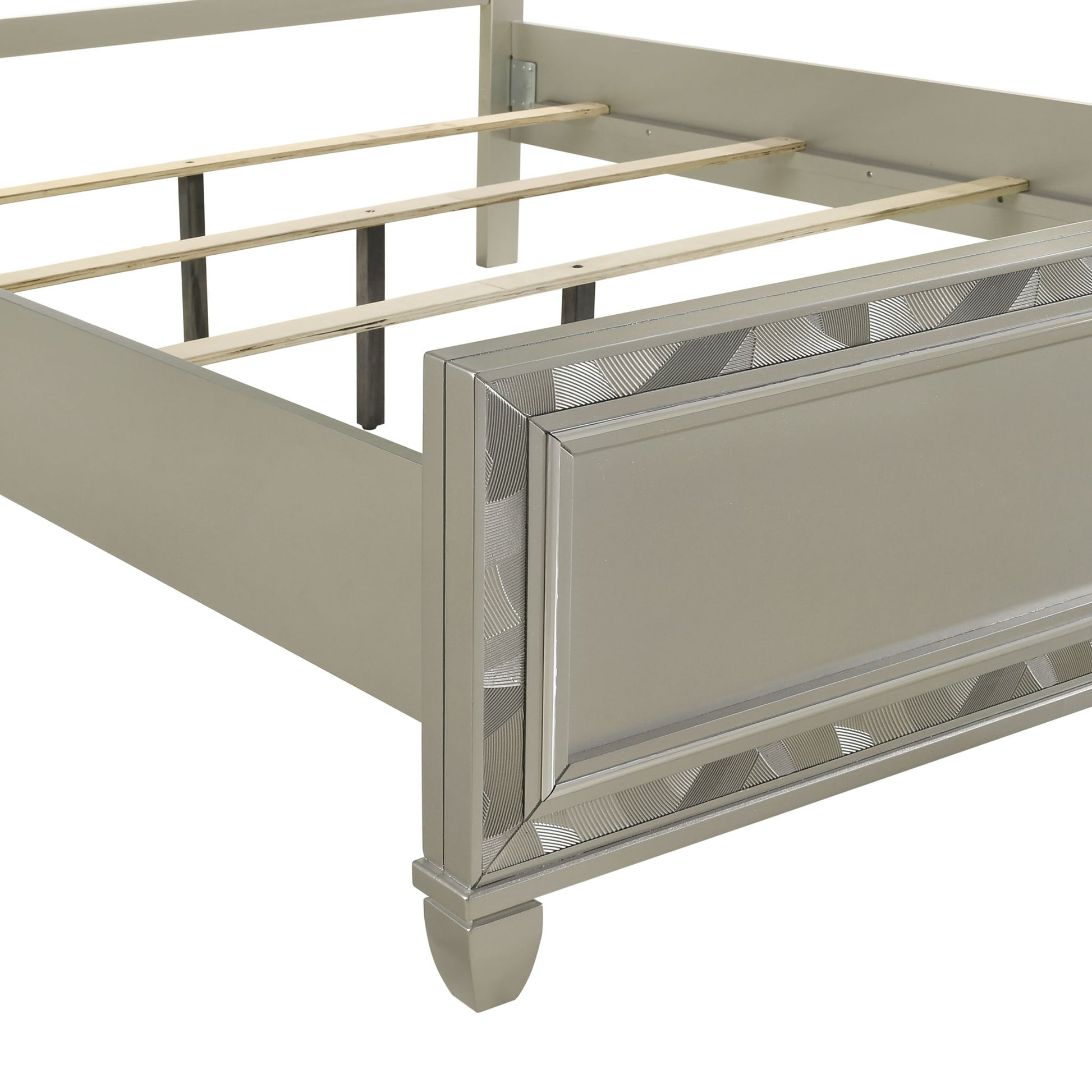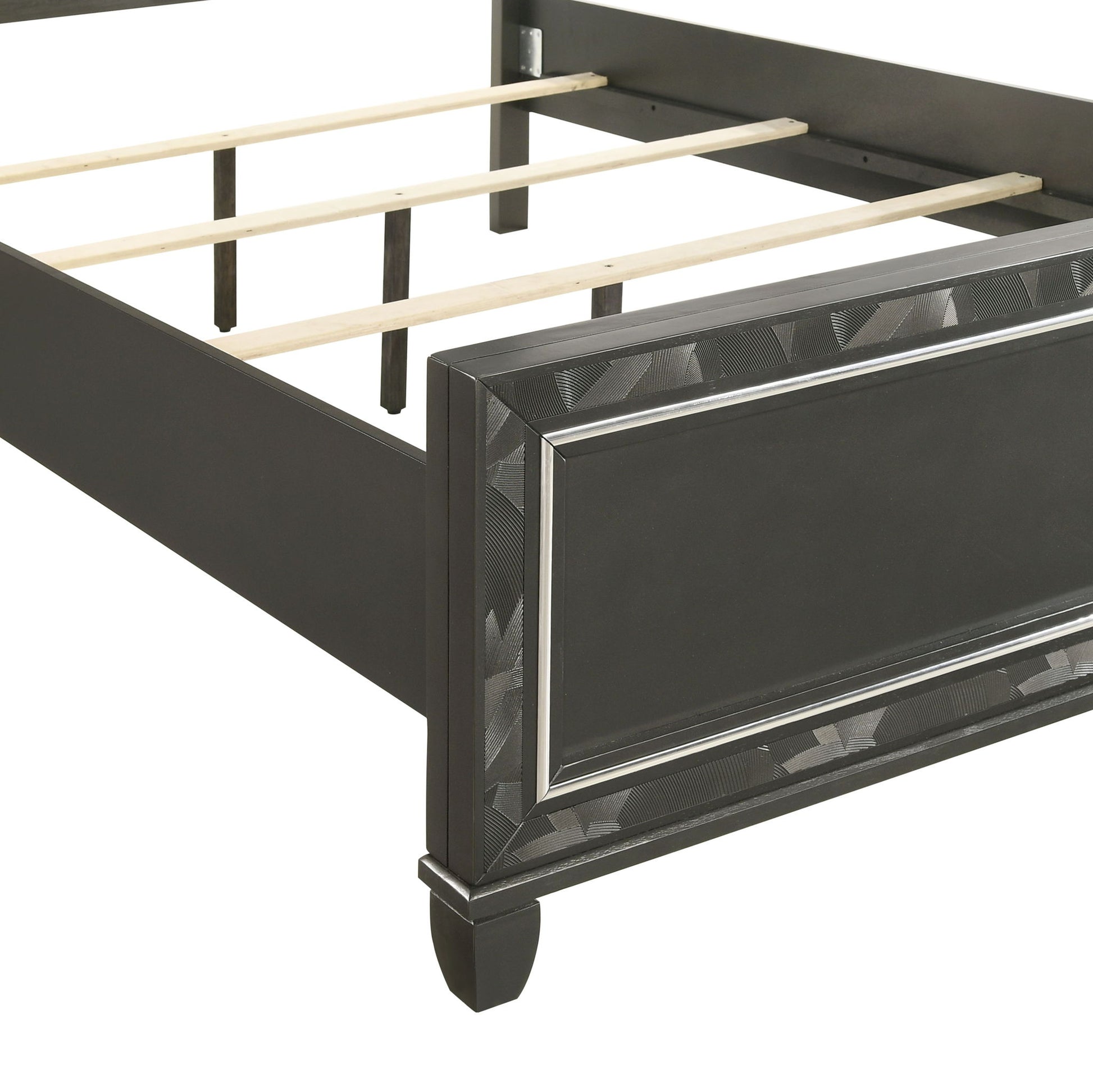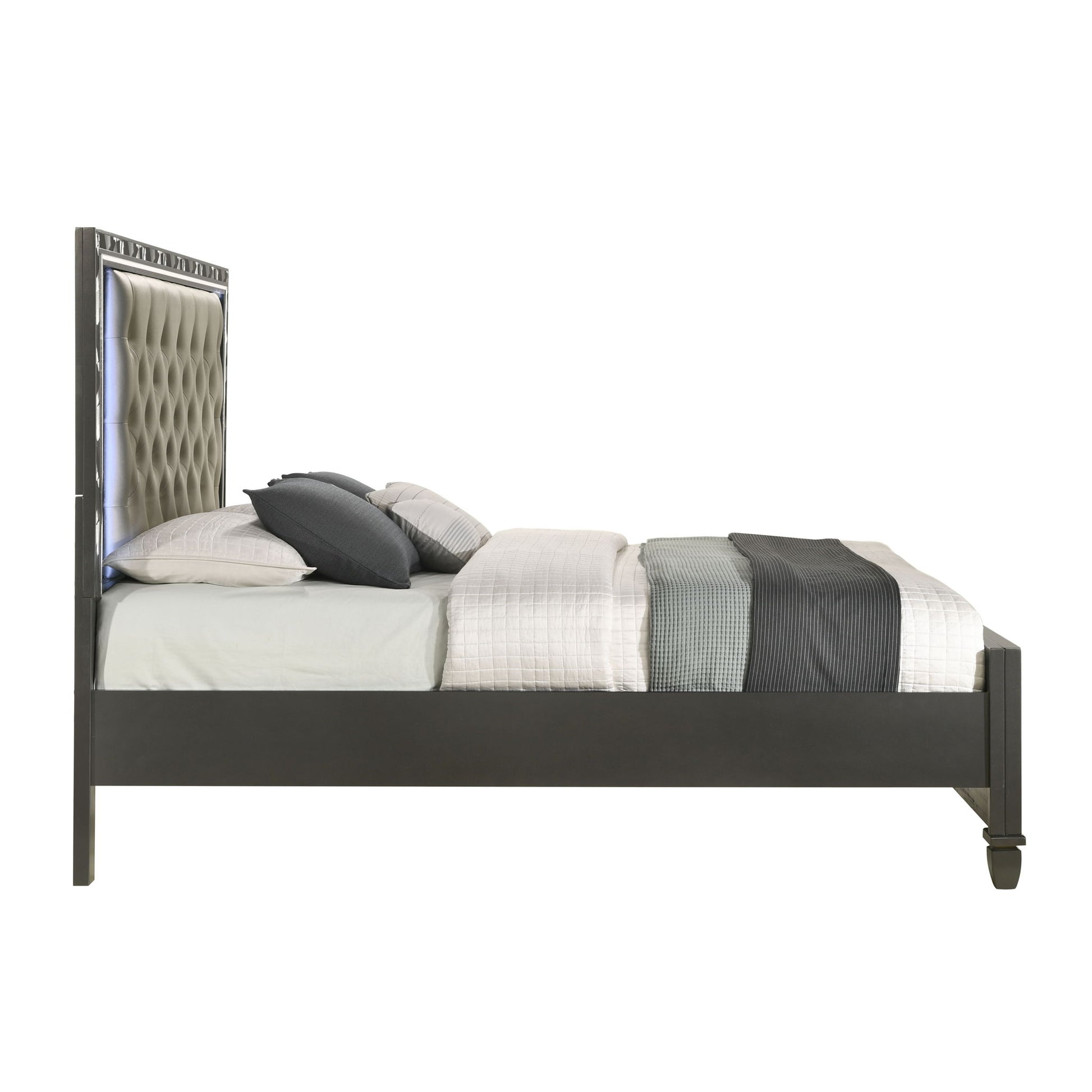 Discover the Radiance Bed, meticulously crafted for enduring stability and durability from a combination of Solid Rubberwood and manufactured woods. Its semi-gloss lacquer finish adds a silky, modern touch to this captivating collection. Glossy textured inlays, mylar trim, and a crushed crystal decorative laminate frame the plushly upholstered, crystal button-tufted headboard, exuding opulent appeal. Designed with functionality in mind, LED lighting accents your space, casting a sparkling glow against the glamorous padded headboard. Transform your bedroom into a haven of luxury and style with the Radiance Bed.