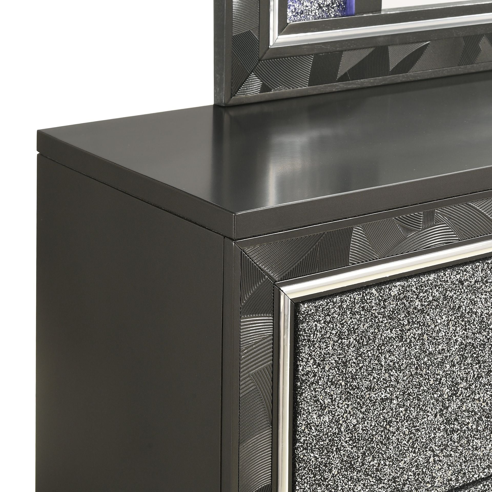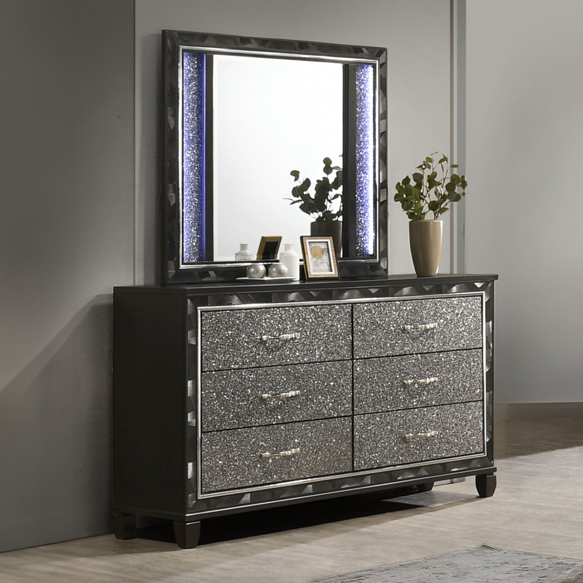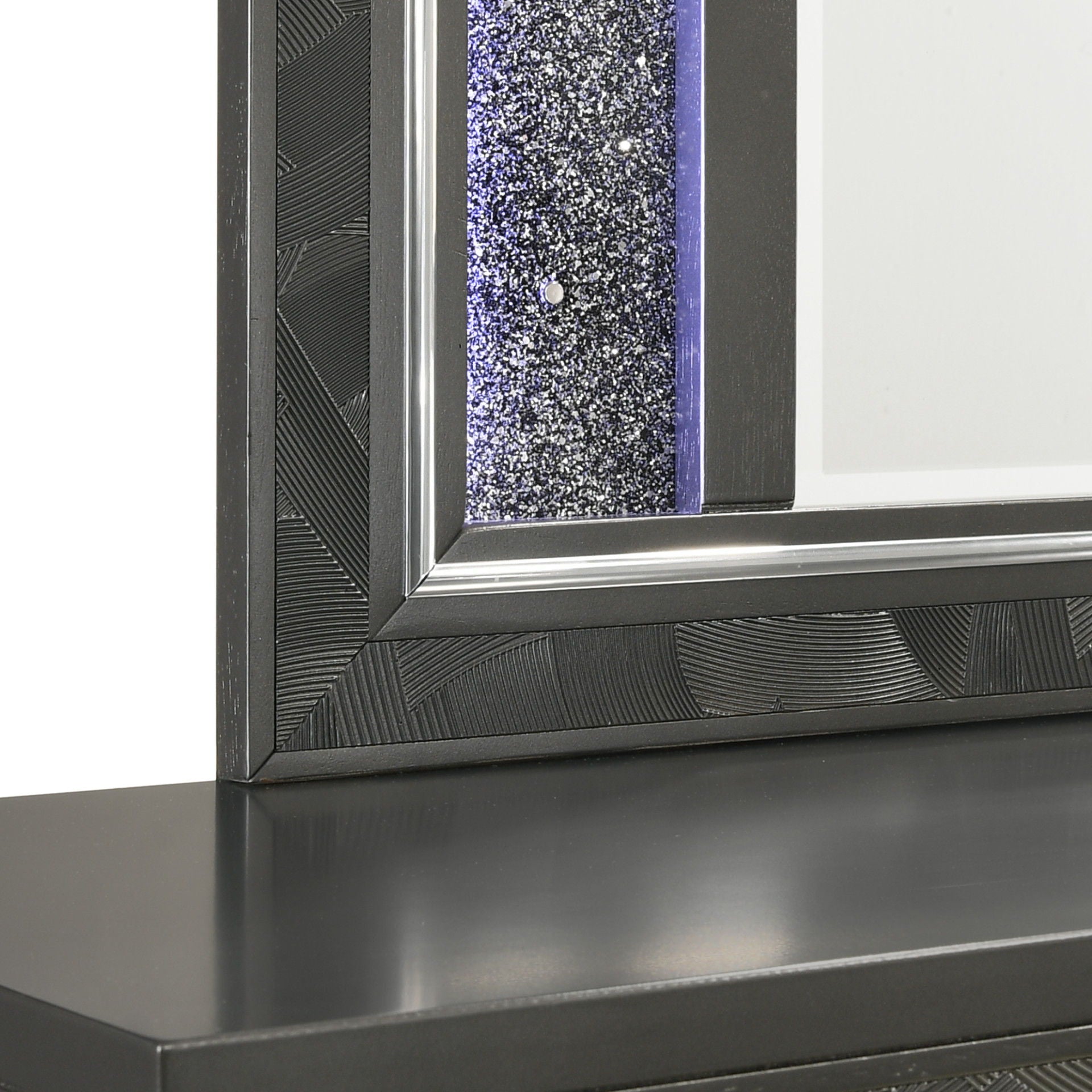 Introducing the Radiance Lighted Mirror, meticulously designed to complement the Radiance 6 Drawer Dresser. Crafted from a blend of Solid Rubberwood and engineered woods, this mirror ensures unparalleled stability and durability. Its semi-gloss lacquer finish adds a silky, contemporary touch to your space. Adorned with Glossy textured inlays, mylar trim, and a crushed crystal decorative laminate frame, this mirror exudes opulence and glamour. Featuring a clear, low distortion beveled glass mirror, it delivers true reflections, while the LED lighting accents your surroundings, casting a sparkling glow against the luxurious frame. Elevate your bedroom decor with the functional elegance of the Radiance Lighted Mirror.