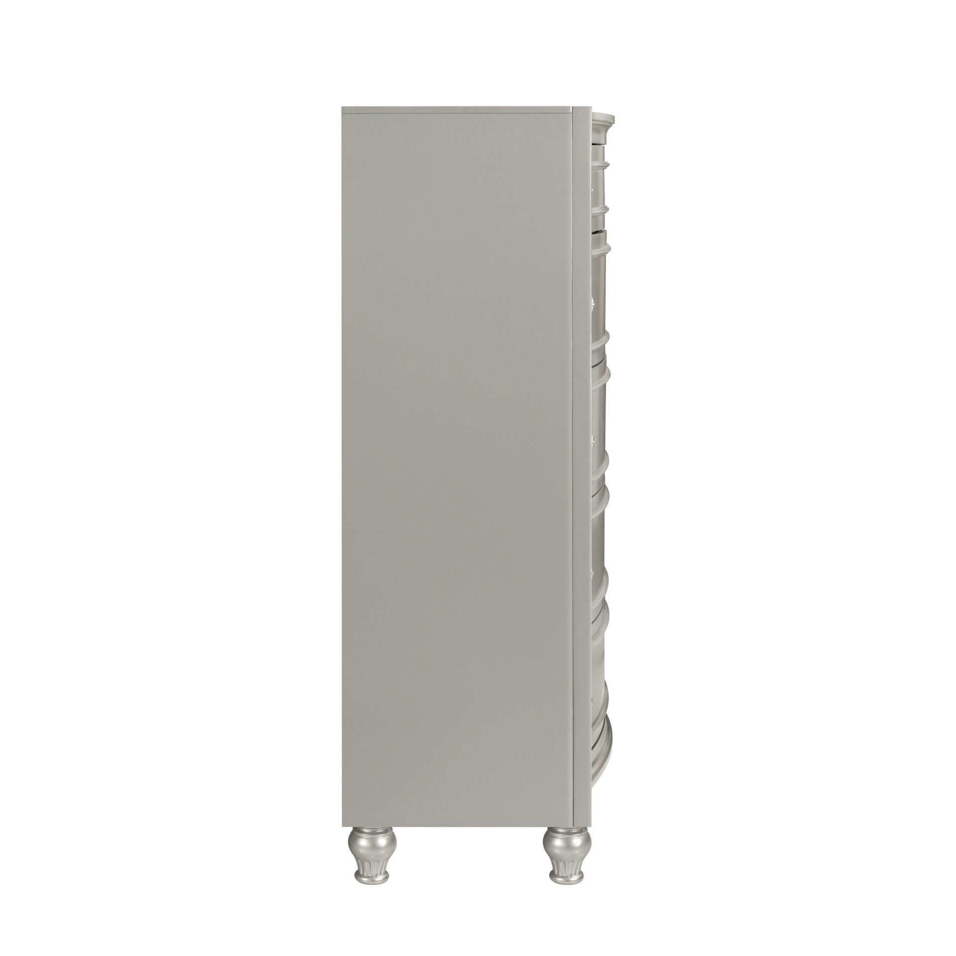 Introducing the Reflection Chest in Silver, meticulously crafted from solid Pine and high-quality manufactured wood to ensure enduring strength and durability. Its glamorous matte silver finish exudes sophistication, reflecting the mirrored panels and silver drawer pulls of the 5-drawer chest, adding an elegant touch to any bedroom decor. Experience sophisticated luxury with bowfront drawers, sumptuous lavender velvet linings, picture frame moldings, and turned bun feet, seamlessly blending classic charm with modern flair. Inside, find meticulous craftsmanship with English dovetail joinery, full extension drawer glides, finished interiors, and select velvet-lined drawers to safeguard delicate items. Enjoy extra upgrades such as the cedar-lined bottom drawer, perfect for sweater storage. This chest is not just a piece of furniture—it's a marvel of design and practicality, destined to enhance your bedroom space with style and functionality.