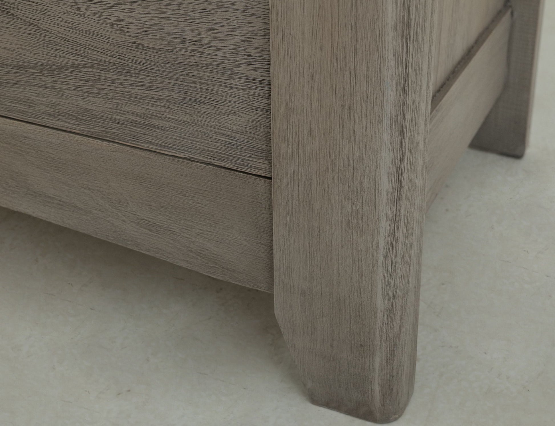 4 Drawer, Chest. The Ridge Chest features four spacious drawers, offering plenty of storage for all your bedroom essentials. It features sleek metal handles that enhance its modern aesthetic. Made from Melina and poplar wood, this collection guarantees durability and timeless appeal. The elegant light gray finish and brown tops blend seamlessly with any décor style. Additionally, the channeled design adds a touch of sophistication and texture to the furniture.