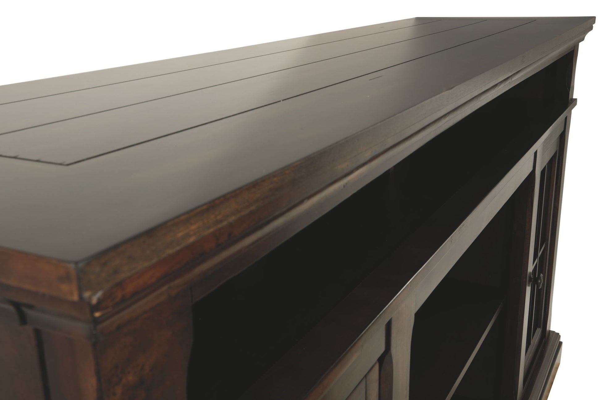The beauty of this TV stand will immediately engage you. The slight breakfront shape is a rare find and an ideal fit among traditional and eclectic tastes. Soft black undertones highlight the warm finish. Multiple cubbies and glass-door enclosed shelves organize your audio/video components and plenty of extras. Sold separately, an electric fireplace fits neatly in the center cubby.