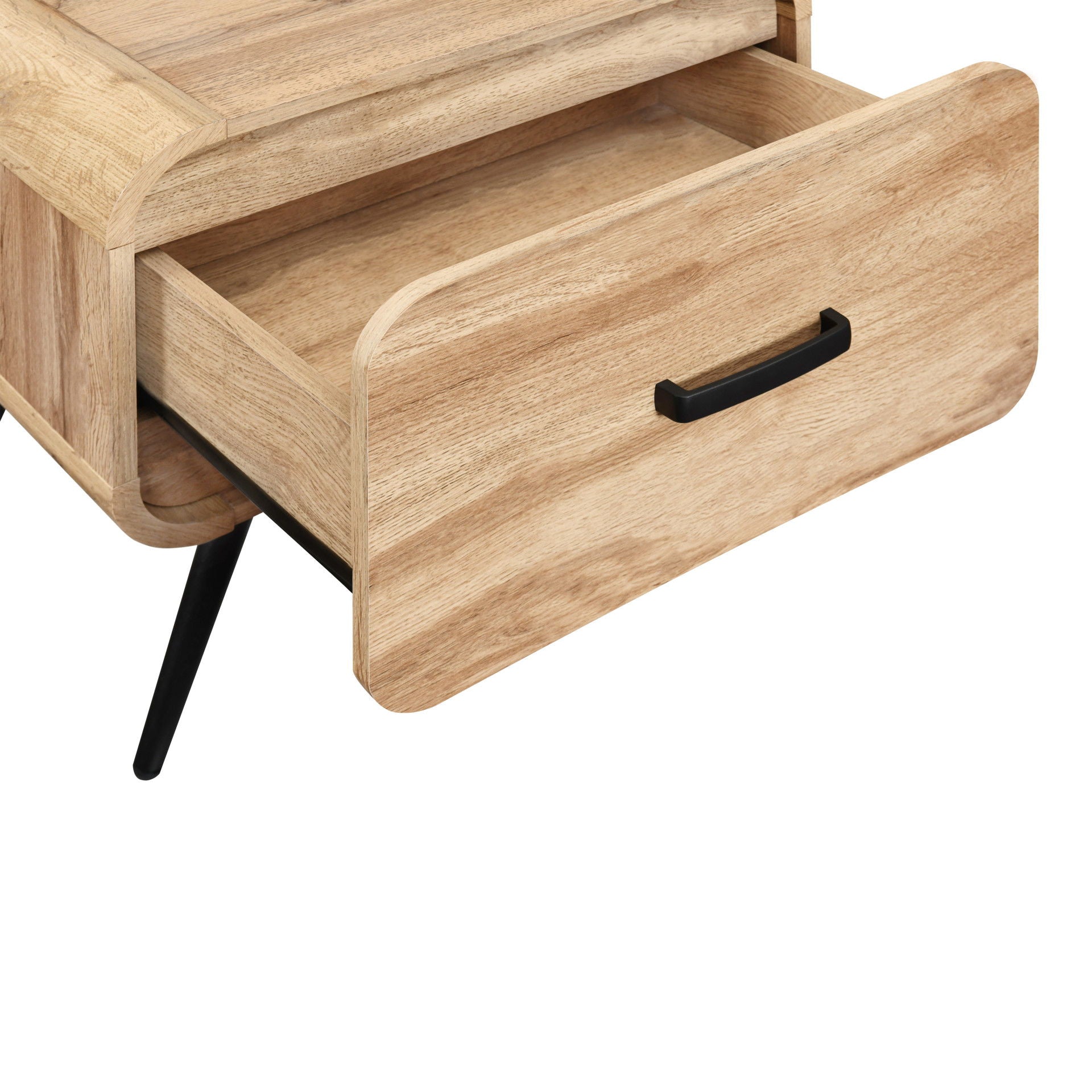 The Rowan One Drawer End Table blends mid-century modern style with practical design. Crafted from eco-friendly manufactured wood in a warm oak finish, it features rounded corners, tapered legs, and a smooth-glide drawer for bedside or living room storage. Subtle black accents add a modern touch. Assembly takes about 30 minutes with included instructions—perfect for adding sleek, functional charm to any space.