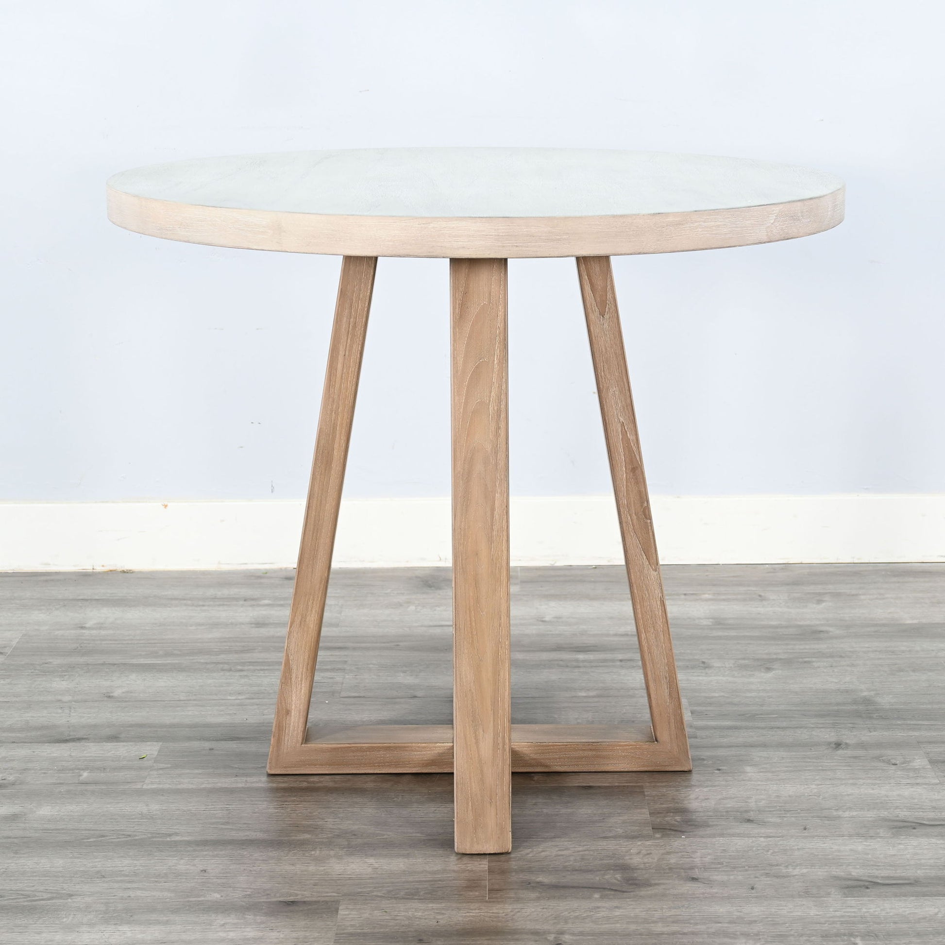 This elegant piece seamlessly marries contemporary design with a hint of rustic allure, showcasing a harmonious blend of wheat and light grey tones. The wire-brushed texture enhances the natural beauty of the mindi wood, creating a distinctive and visually appealing surface. The round shape adds a touch of sophistication to your dining space, promoting an intimate and inclusive atmosphere for shared meals and gatherings.