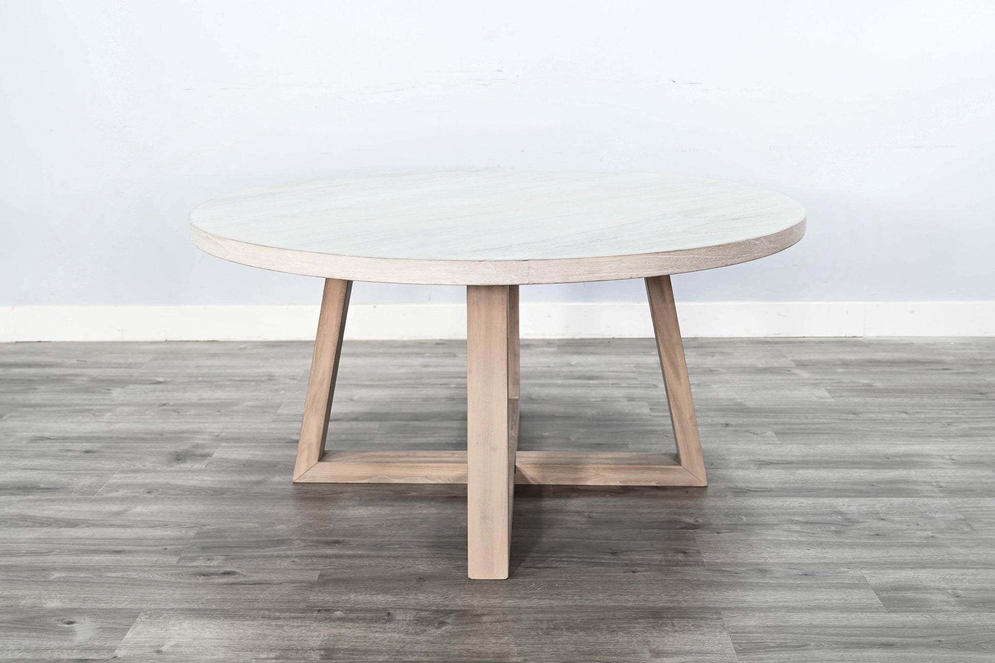 This elegant piece seamlessly marries contemporary design with a hint of rustic allure, showcasing a harmonious blend of wheat and light grey tones. The wire-brushed texture enhances the natural beauty of the mindi wood, creating a distinctive and visually appealing surface. The round shape adds a touch of sophistication to your dining space, promoting an intimate and inclusive atmosphere for shared meals and gatherings.