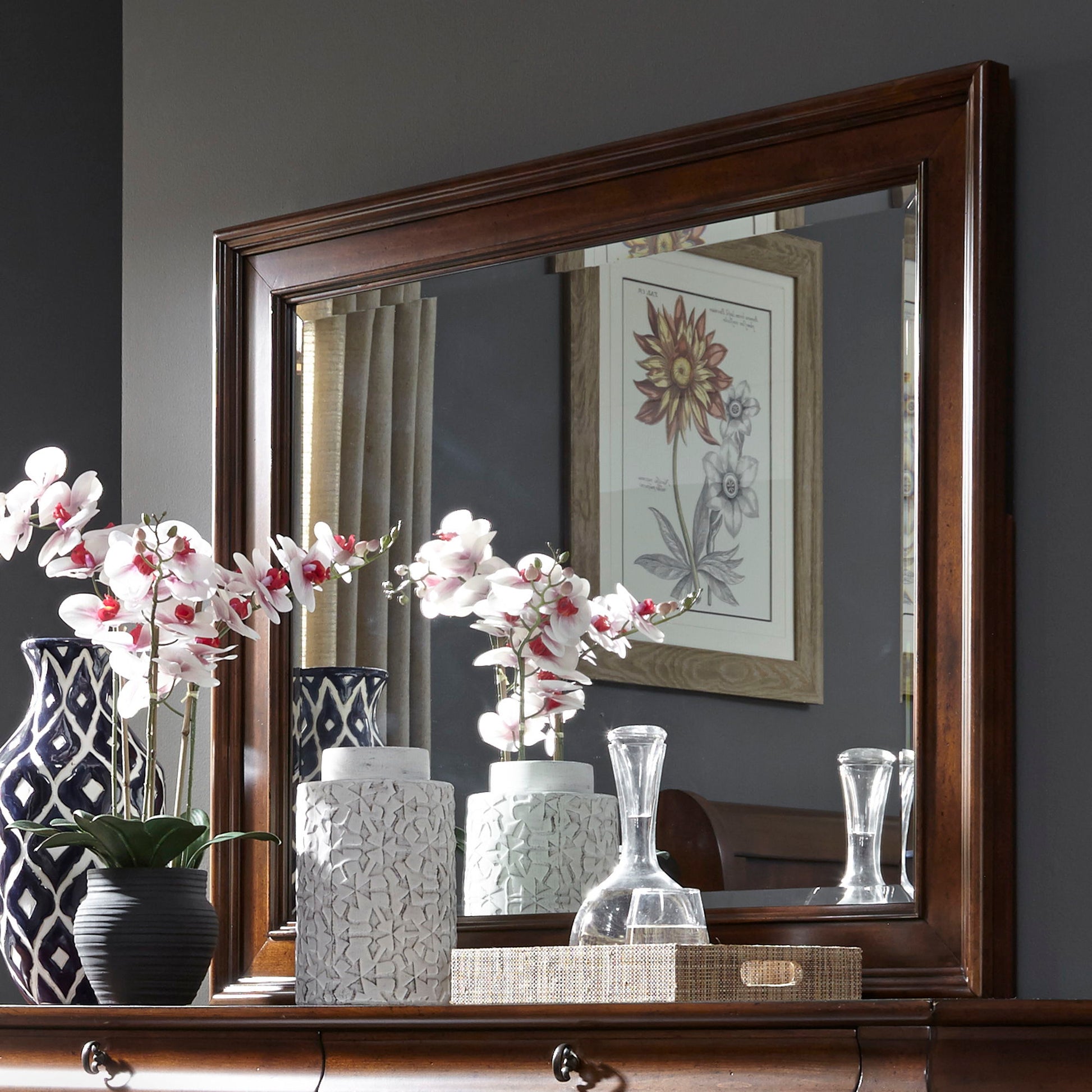 Add to your casual traditional look with the Rustic Traditions landscape mirror. The rustic cherry finish is attained through pin knotty cherry and a well-worn look. This Louis Philippe style piece features beveled glass, effortlessly framing the mirror.