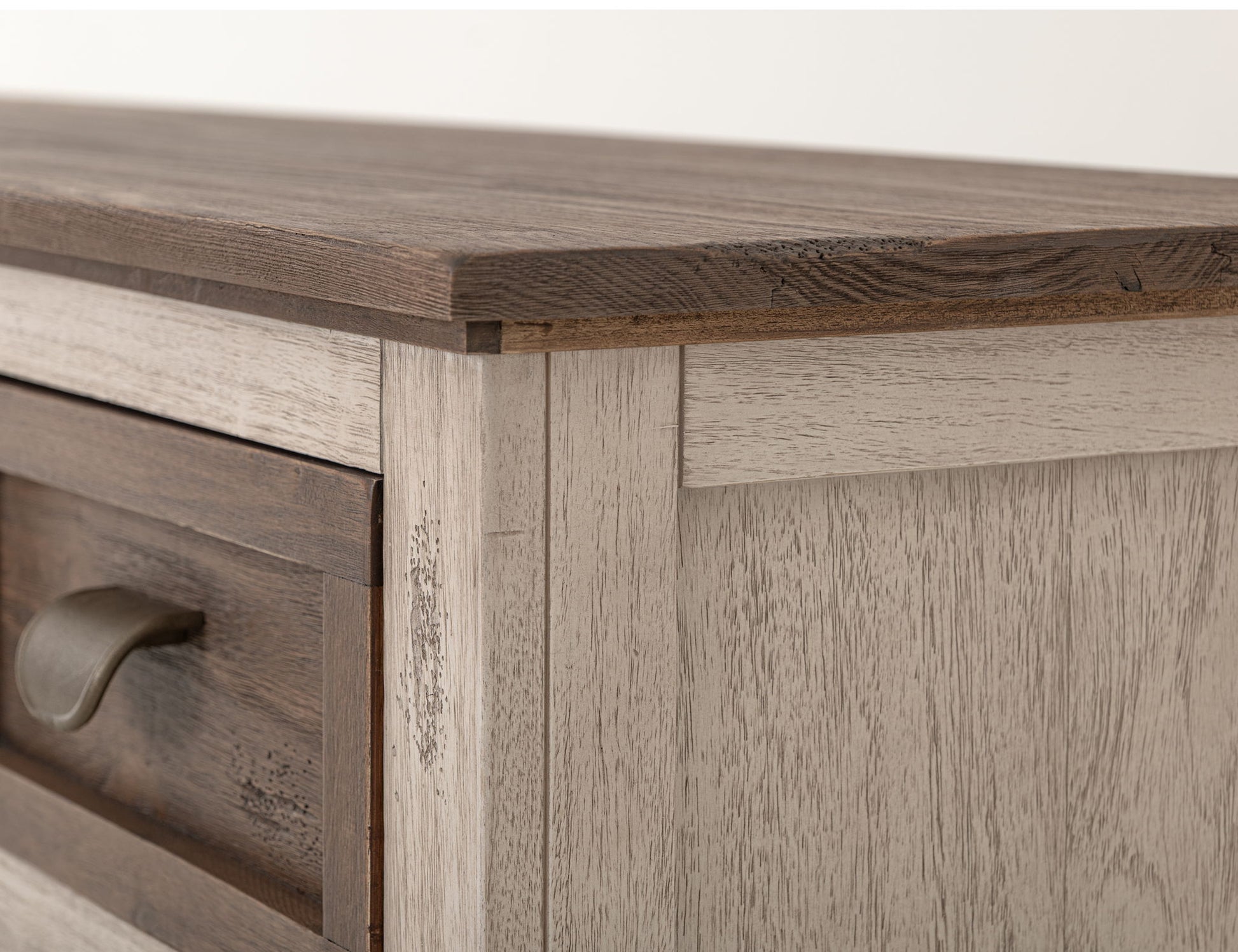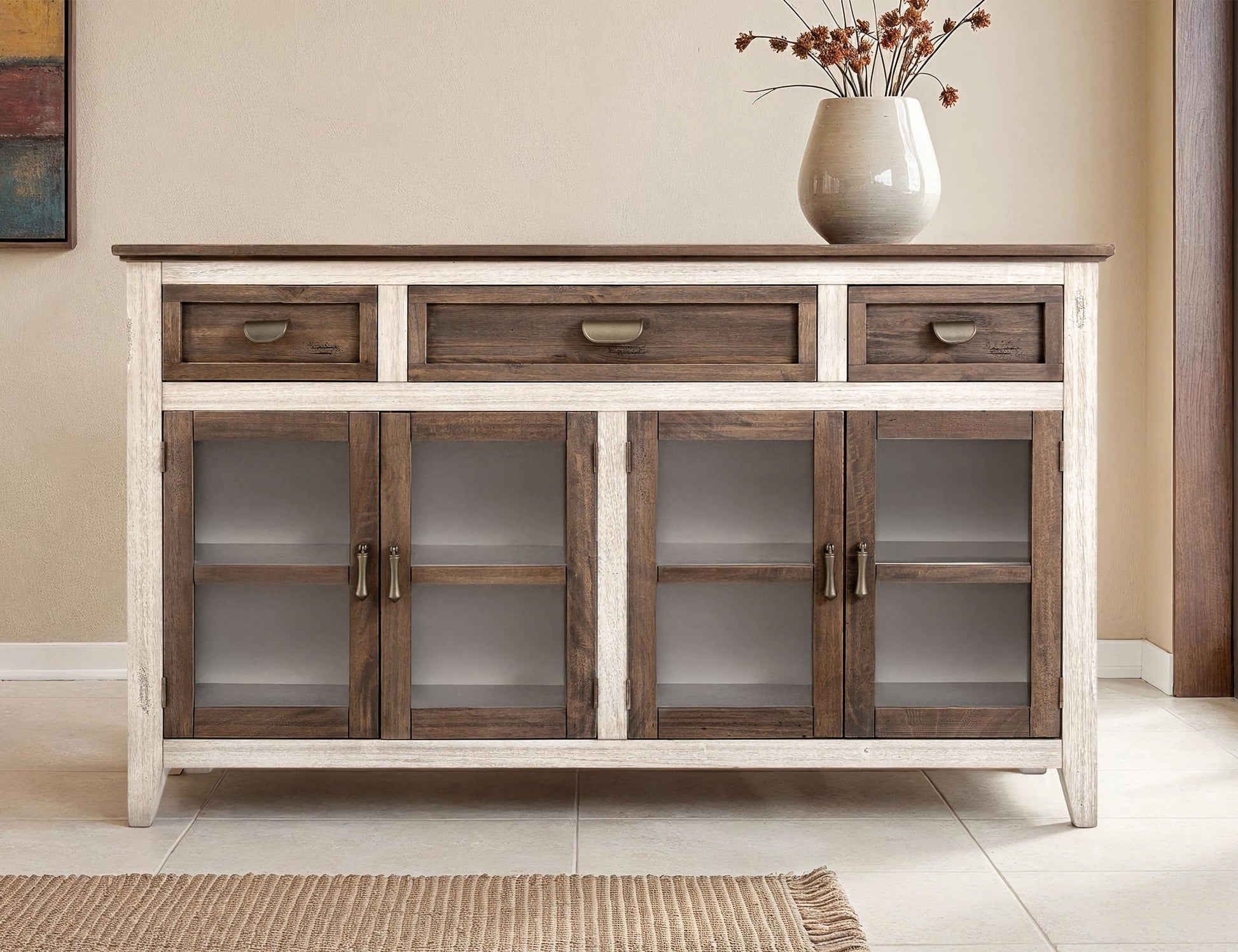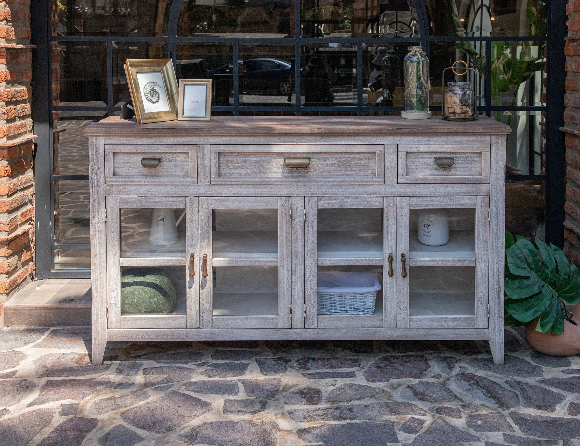3 Drawer 4 Glass Door Console. Introducing Sahara, an organic modern collection designed to transform your space into a tranquil and neutral haven. Crafted from sustainably sourced, lightly distressed mango wood, this stunning minimalistic collection effortlessly blends style and sustainability, making it a perfect fit for any space.