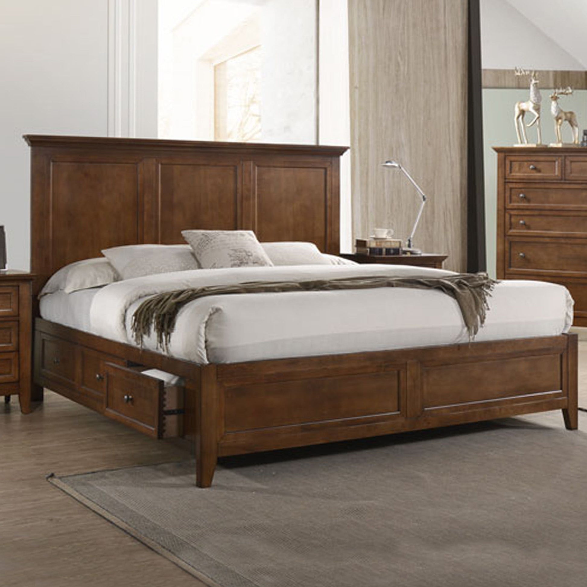 Solid wood bedroom suite available in three classic finish colors - Tuscan, Rustic White, and Gray. Storage and standard bed rails in queen and king sizes plus four case piece options give plenty of room for organization. A gorgeous bedroom set that will last in function and style.