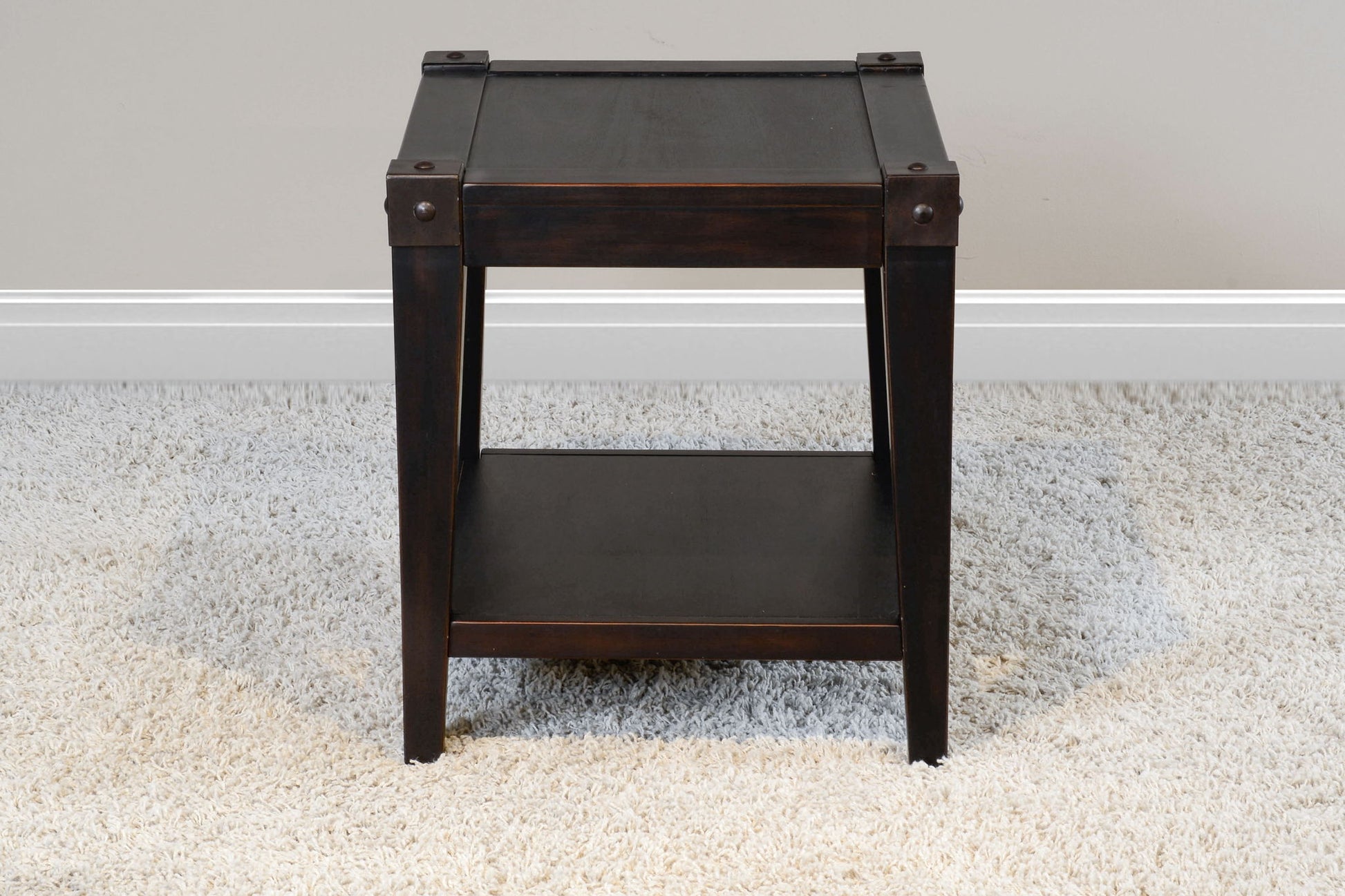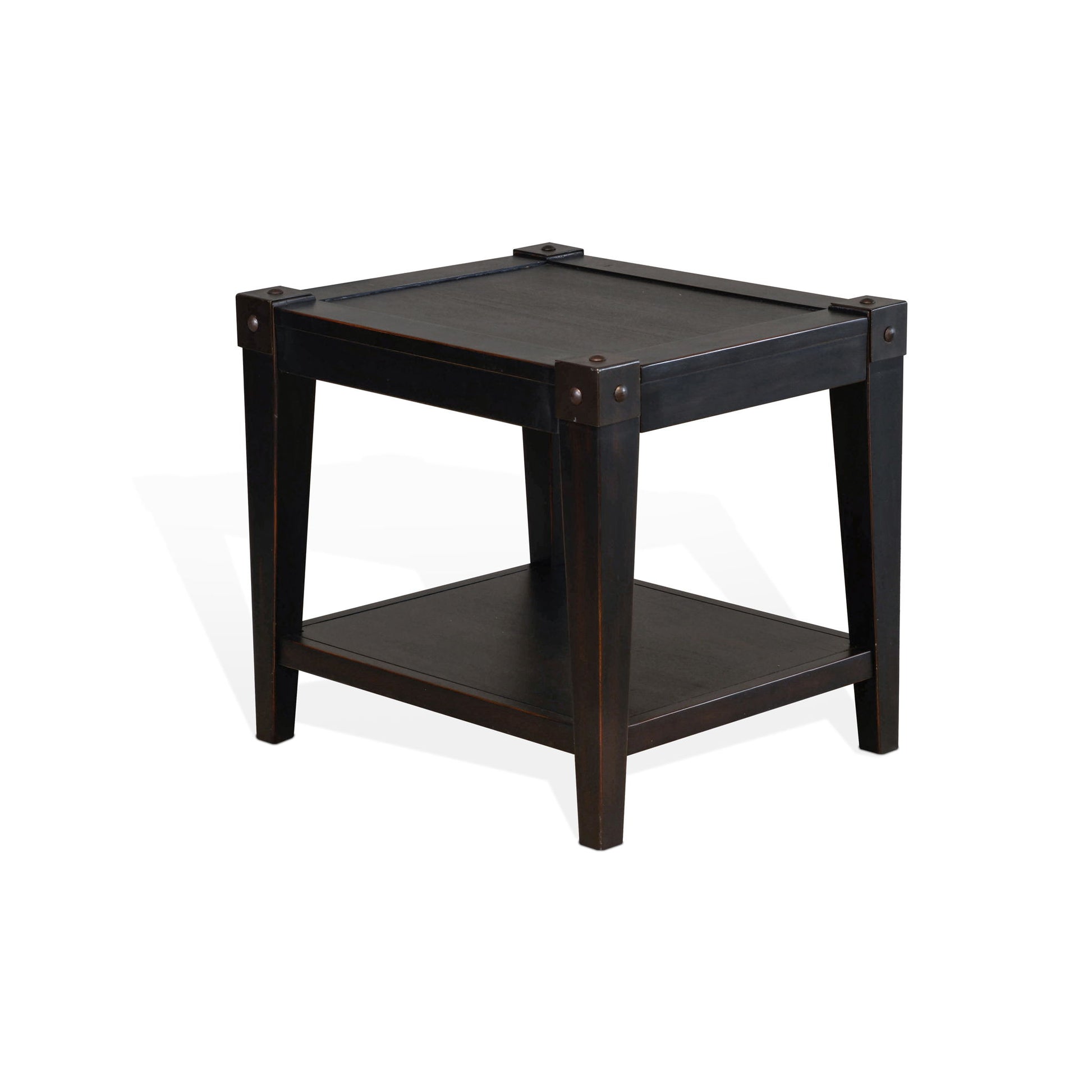 The Seal Beach end table was built with mahogany solids and veneers, decorative metal corner caps, and finished in a Black Walnut finish.