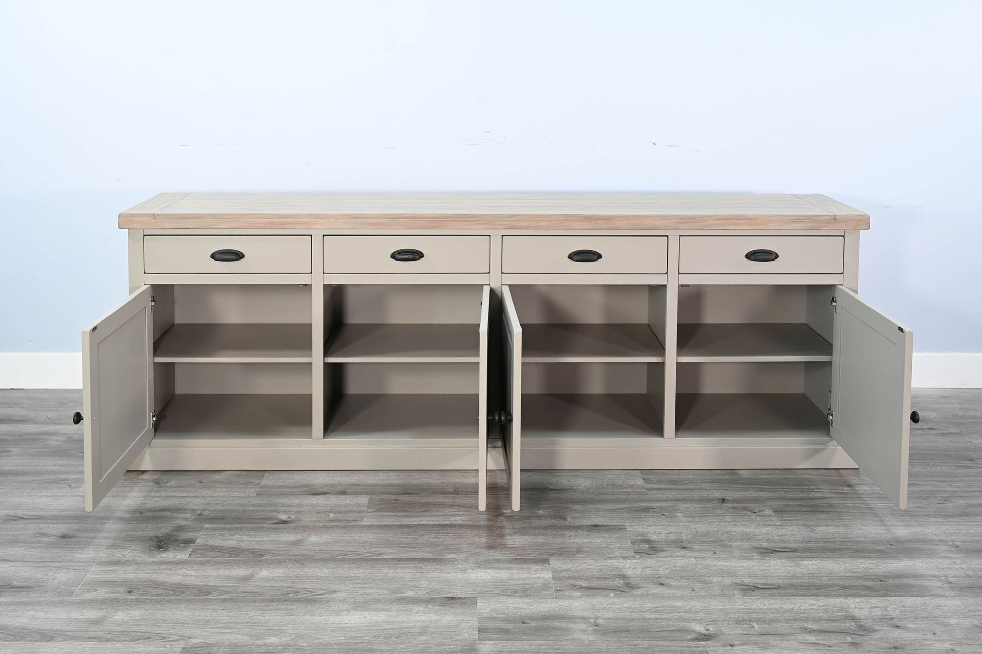 A versatile and stylish addition to your living or dining space that effortlessly combines modern design with practical storage. This server cabinet, featuring a sleek grey finish, adds a contemporary touch to your decor. With four spacious drawers and two cabinets, it provides ample storage for organizing your essentials. The drawers are designed for easy access, and the cabinets with adjustable shelves offer customizable space to accommodate various items. The clean lines and neutral color make this server an adaptable piece, blending seamlessly with different interior styles.