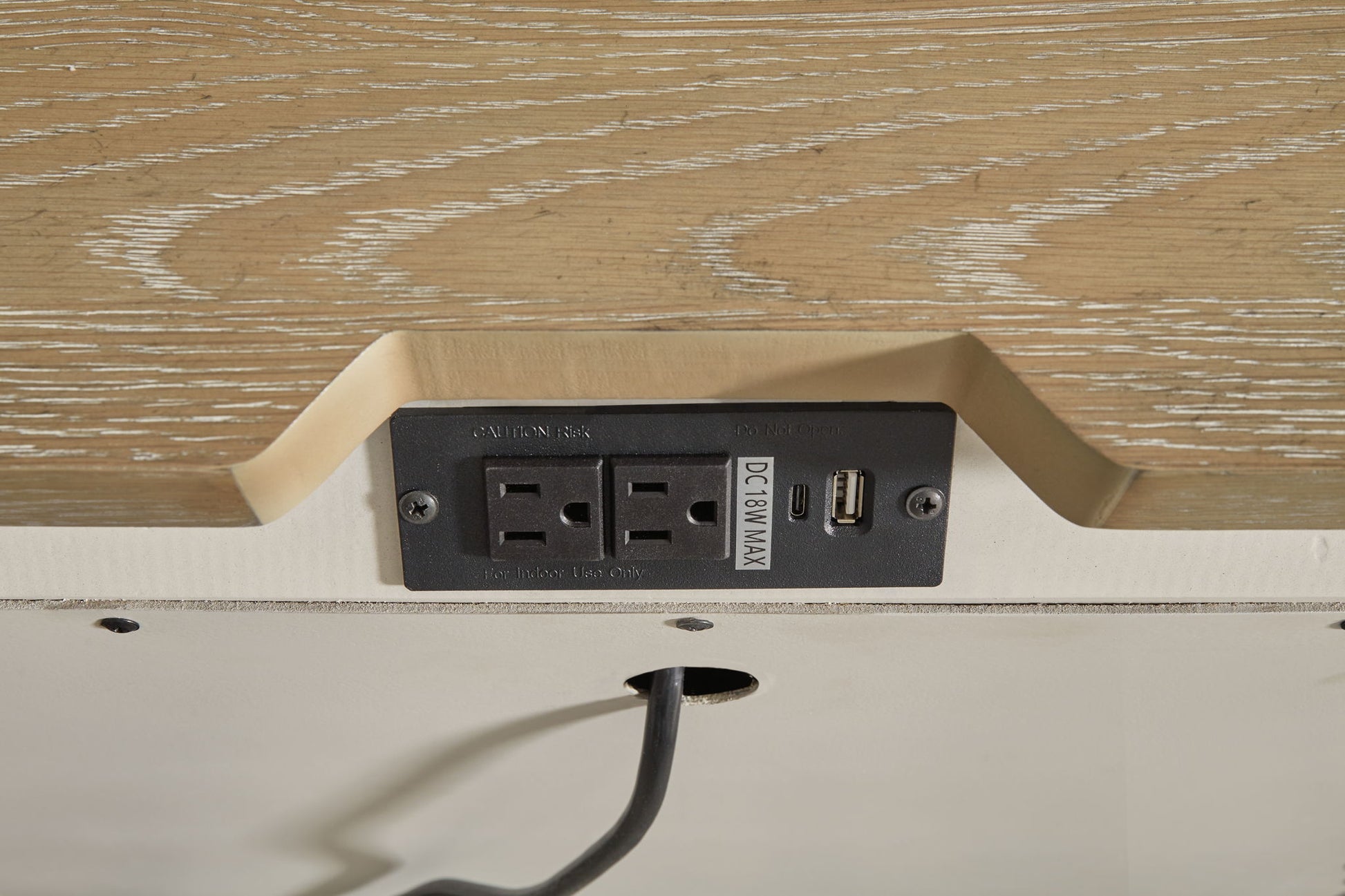 This nightstand elevates the art of modern farmhouse design. Its two-tone aesthetic blends antiqued white and light grayish brown for a charming finish. Two strikingly simple drawers lend a hand with conquering clutter, while AC power and two USB ports provide fast bedside charging. Conveying a feeling of relaxed comfort, the piece is sure to carry you away to a dreamy time and place.