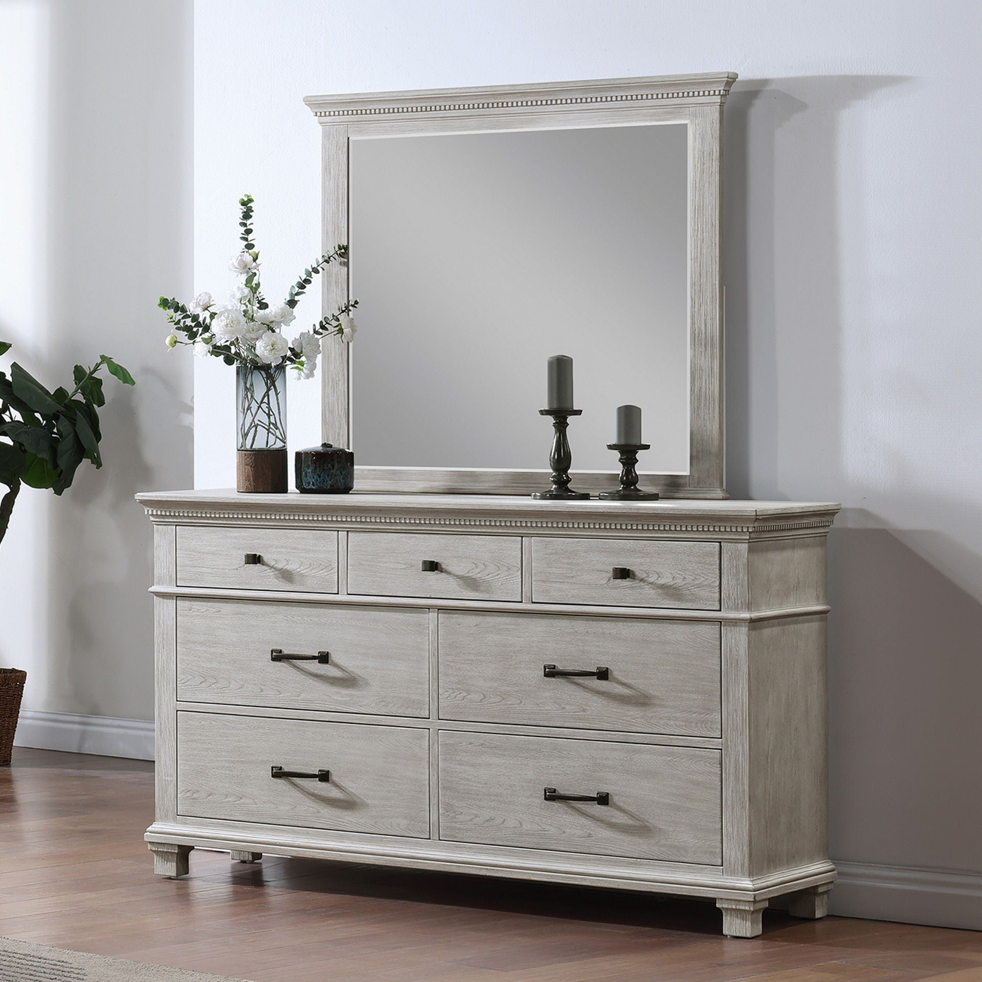 The Silver Sands Mirror showcases durable, quality construction, crafted from solid pine and oak wood veneers for a beautifully framed piece. Its transitional style blends clean, simple lines with a rustic wood finish, creating a calm and inviting atmosphere. The misty gray finish, meticulously applied in multiple steps, gives a light, weathered look that highlights the wood's natural grain and mineral patterns. Elegant design elements, including a nicely shaped crown and dentil moldings, add a sophisticated touch. The low-distortion mirror ensures a clear, accurate reflection, making it a practical and stylish addition to any room. Combining functionality and elegance, this mirror enhances both traditional and modern decor styles.
