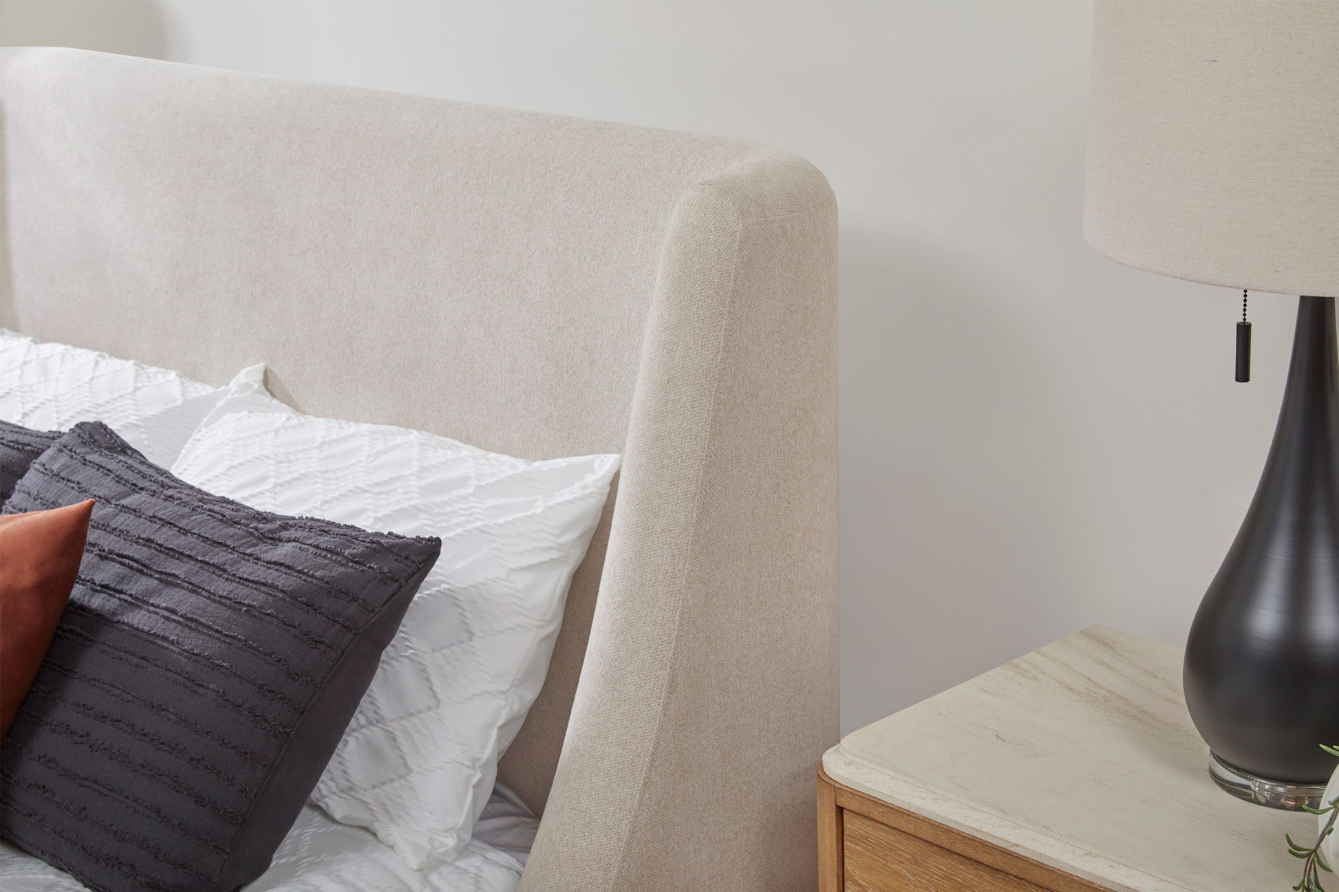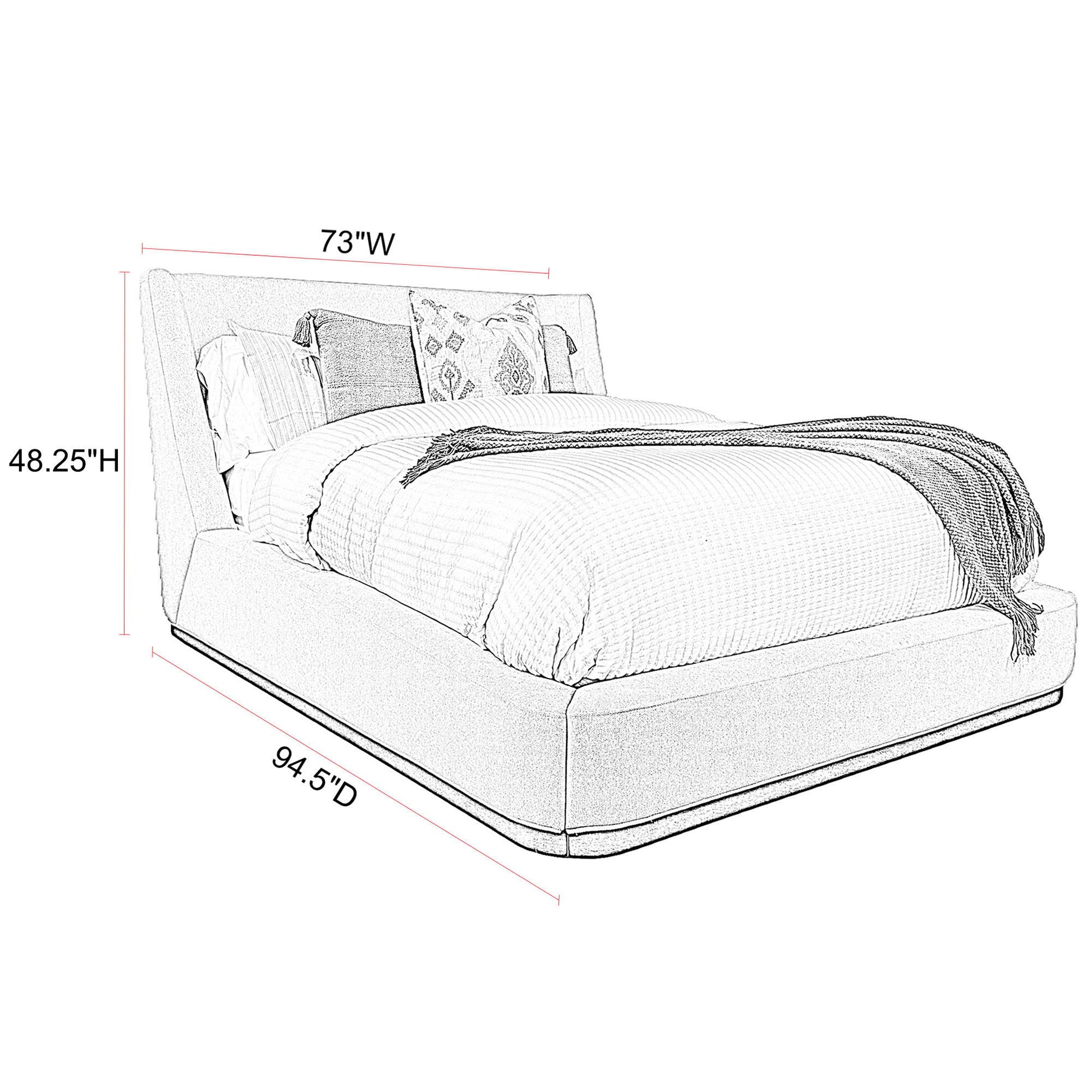 Add a complete cool factor to any bedroom with the shelter-inspired Sofia bed. Its tapered rail creates a sleek look, and the medium wood-tone trim adds a modern touch. The clean lines and large headboard suit various styles. Available in Queen or King size, it does not require a foundation, making it a perfect centerpiece for any bedroom.