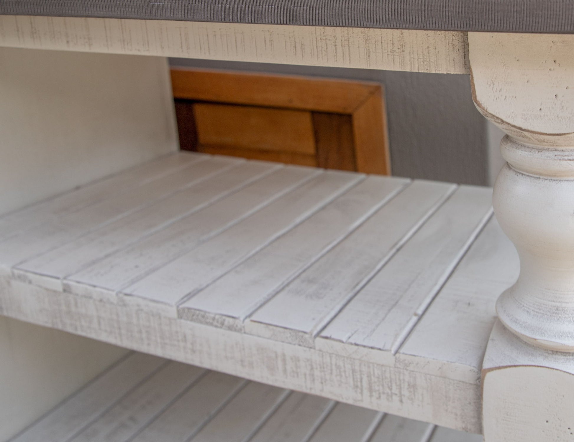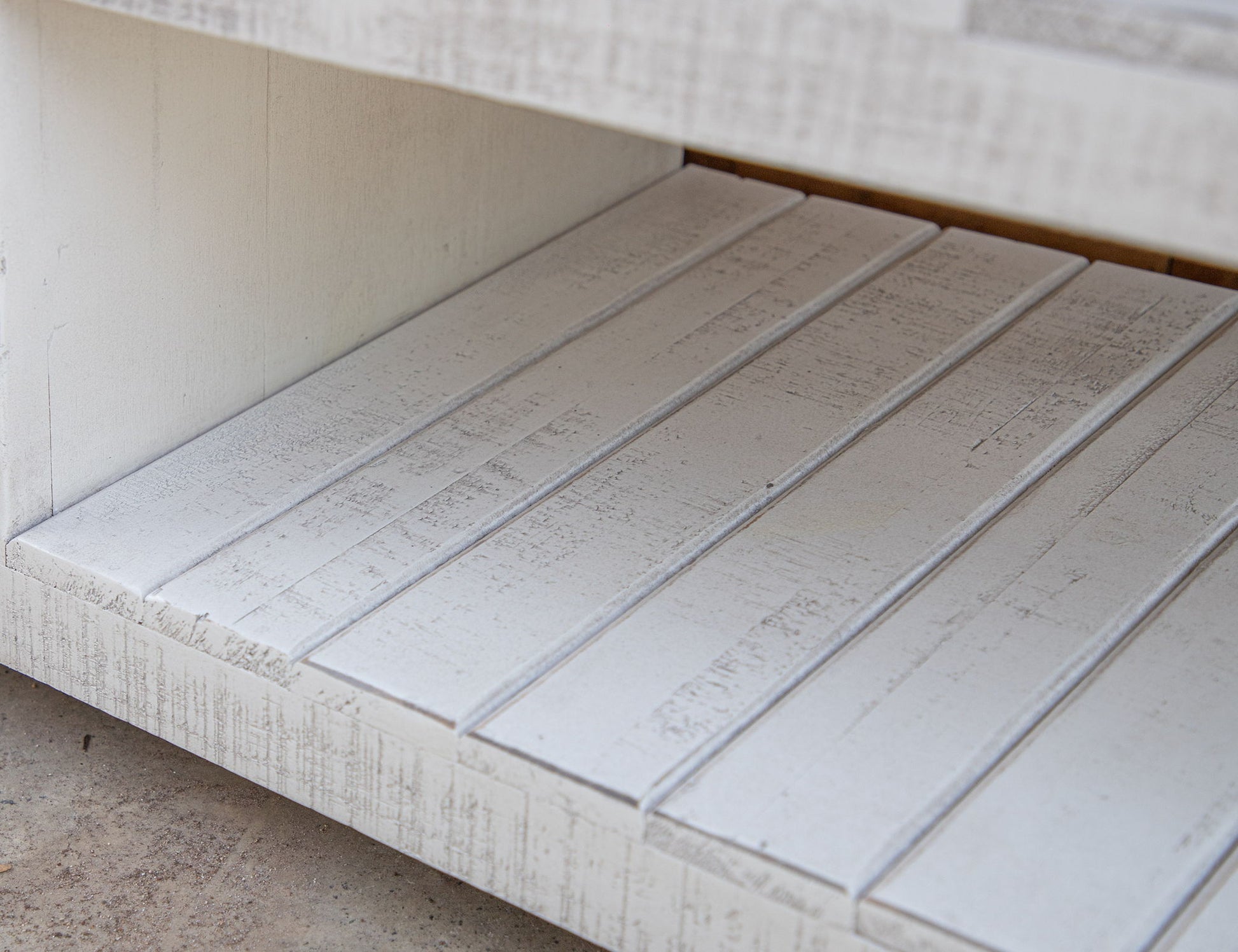 2 Door 93" TV Stand. Exuding farmhouse chic with just the right touch of old-world charm, the Stone Collection is meticulously crafted from solid pine wood. The wood is lightly distressed, showcasing a white finish and complemented by weathered gray tops.