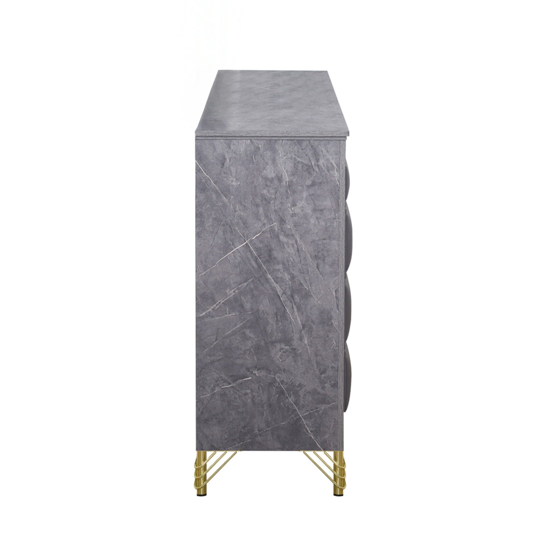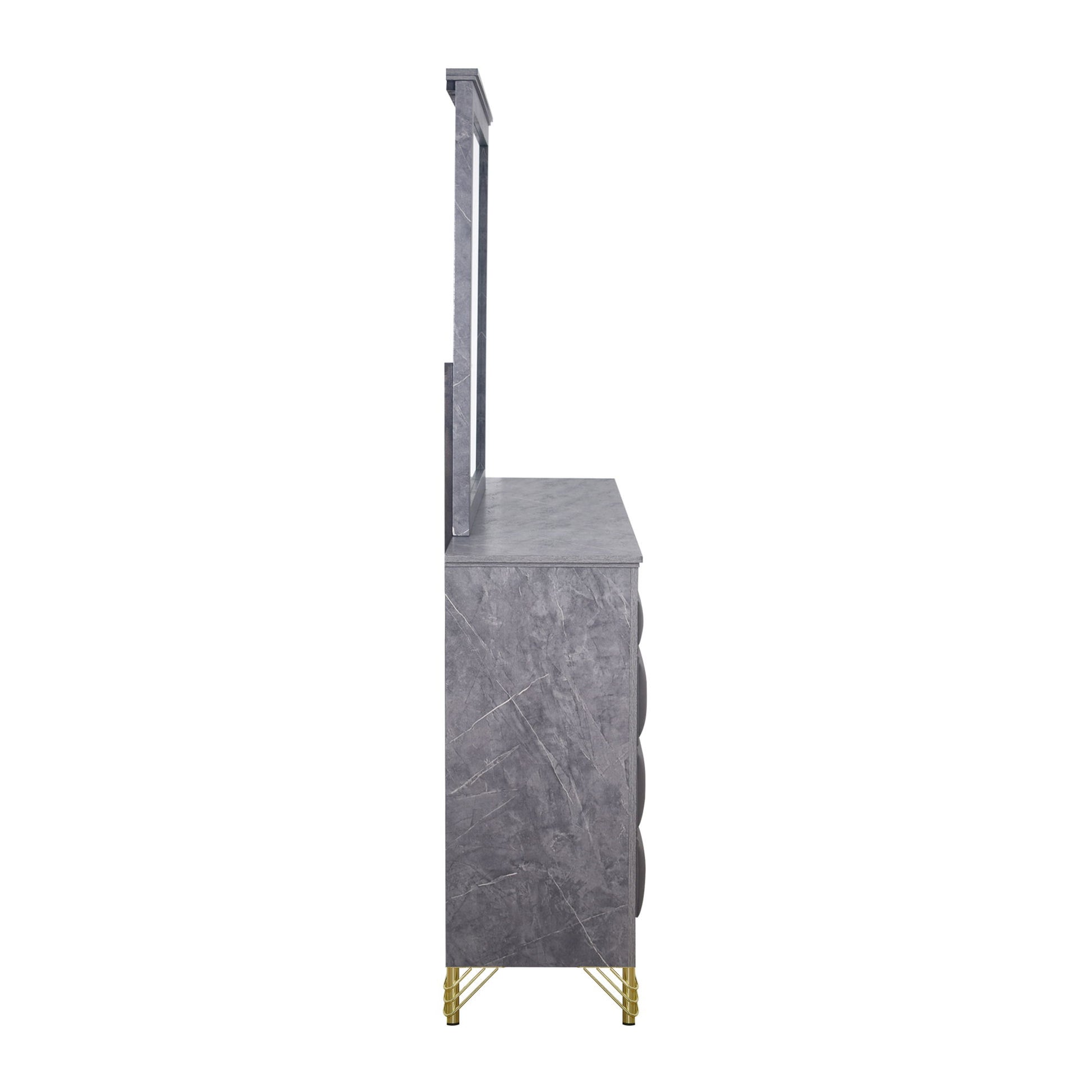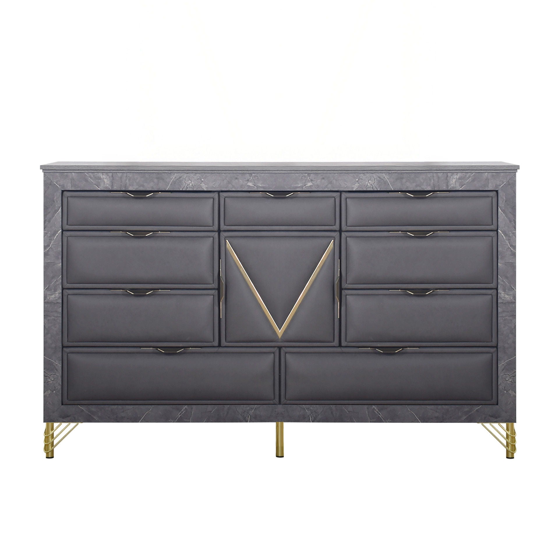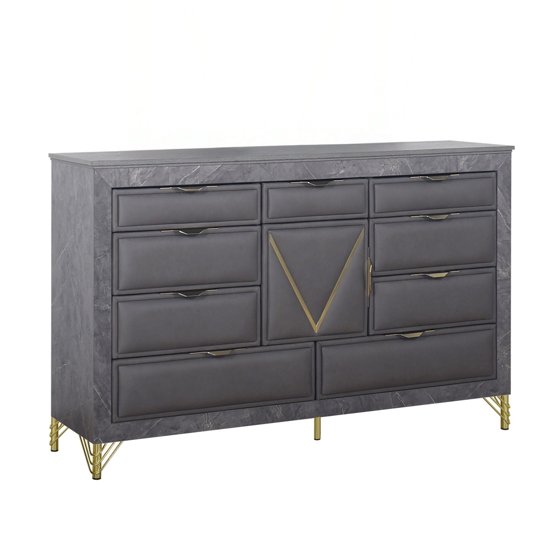 The Symmetry 10-Drawer Dresser blends luxury and function, elevating any bedroom with its glamorous appeal. Crafted from premium woods with an eco-friendly gray marble laminate, it’s a true statement piece. Ultra-soft fabric drawers, adorned with gold metal and mylar accents, add sophistication. Spacious English dovetail drawers glide smoothly on Kenlin ball-bearing tracks for durability. Offering ample storage and timeless elegance, this dresser is the perfect touch of glamour.