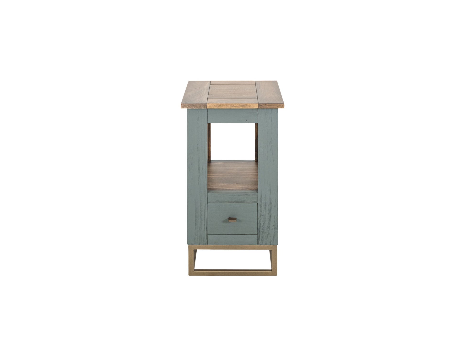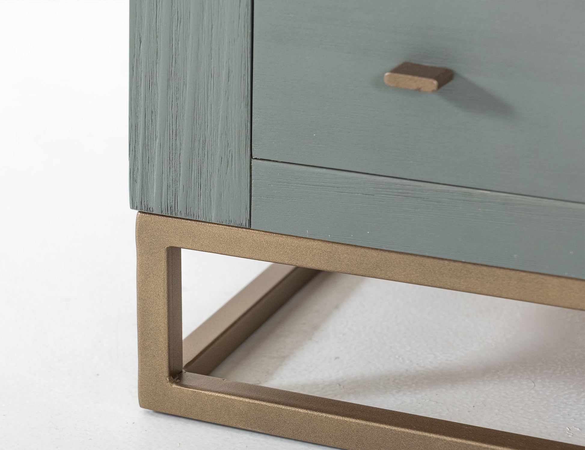 The chair-side table's rectangular shape combines versatility and elegance. It features a convenient drawer for discreet storage and an open shelf for displaying decorative items or books. Its sleek gold metal base provides sturdy support and adds a touch of modern sophistication. The Timber Chairside table is designed to complement the other pieces in the collection and enhance the aesthetic of any room.