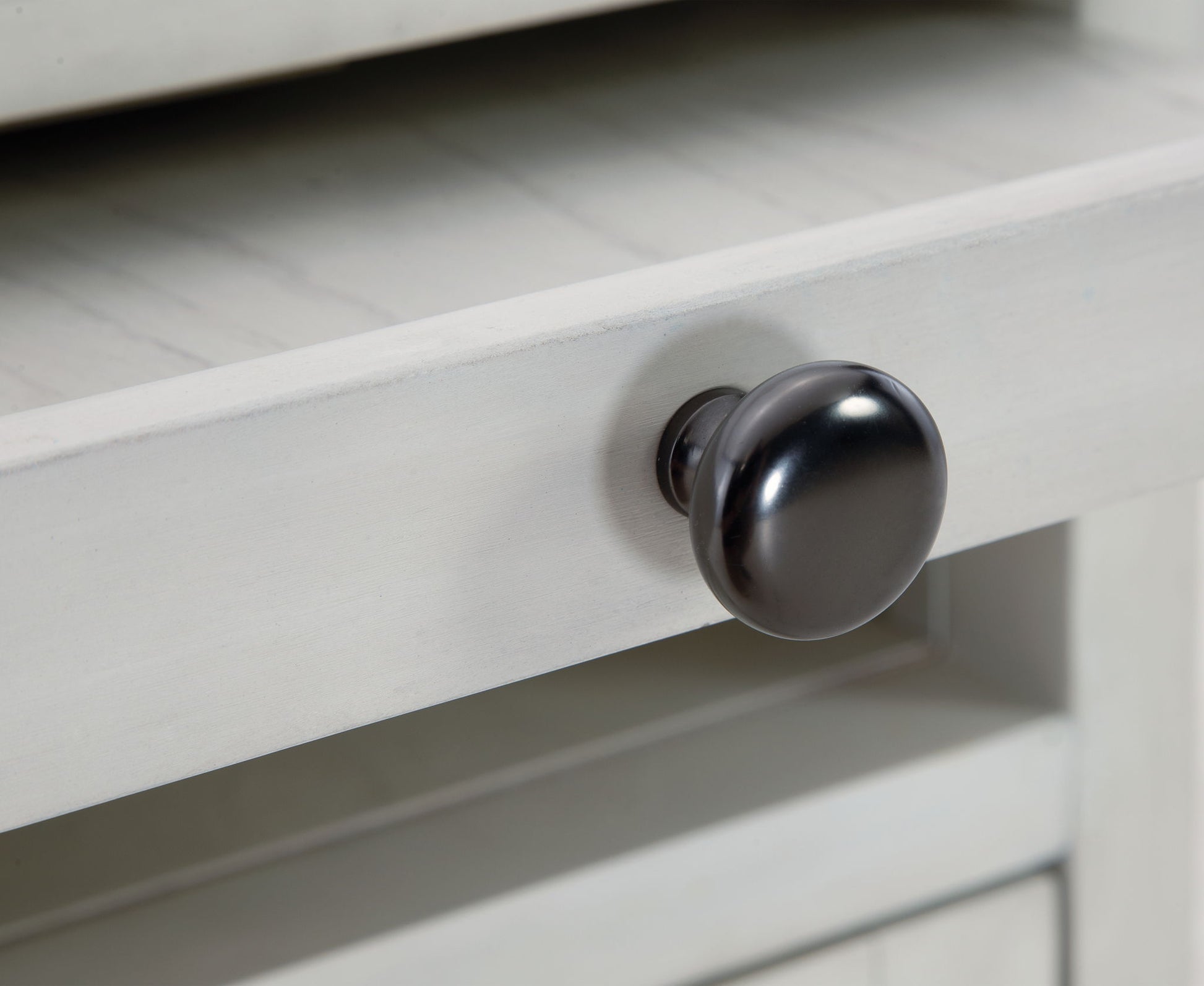 Add big character to a small space with this chairside end table. With its compact size and strong silhouette, it can go anywhere and blend easily into the decor. Less is so much more with the Shaker-inspired design and whitewashed wood grain finish. Loaded with form and function, this end table displays accent pieces and stores essentials securely while keeping devices powered up.