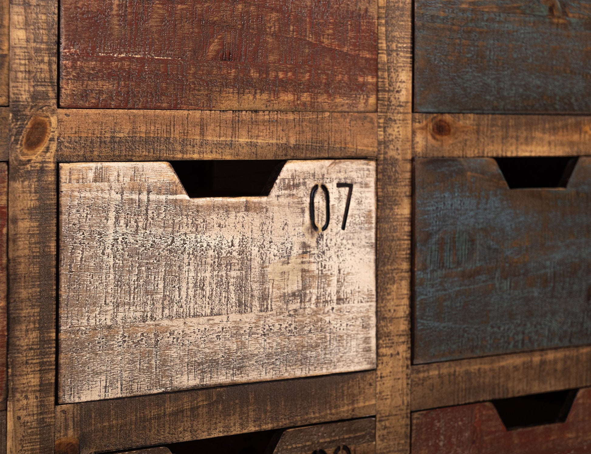 - Multi-step hand-rubbed finish. Drawers have a soft multi-color finish to resemble real recovered wood.