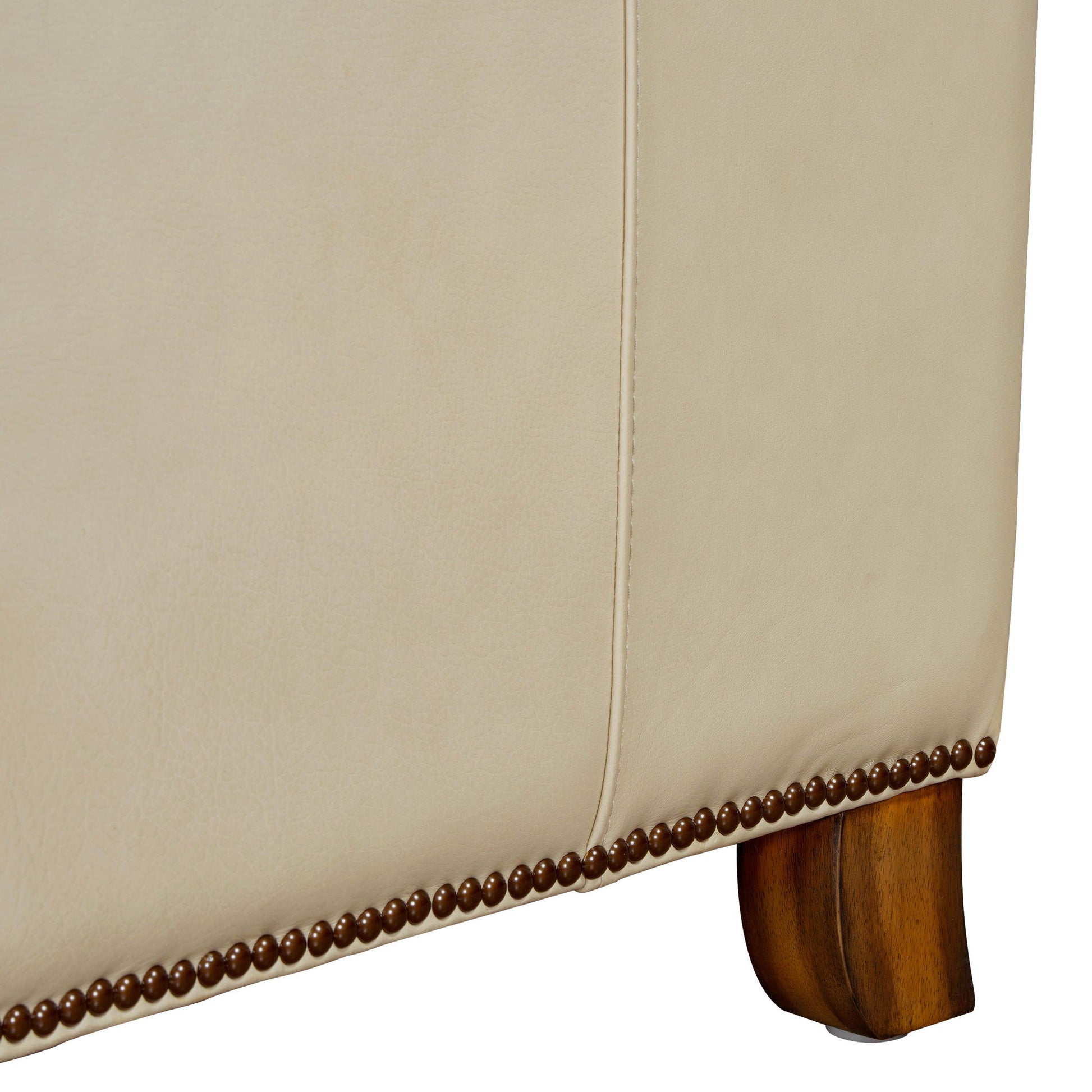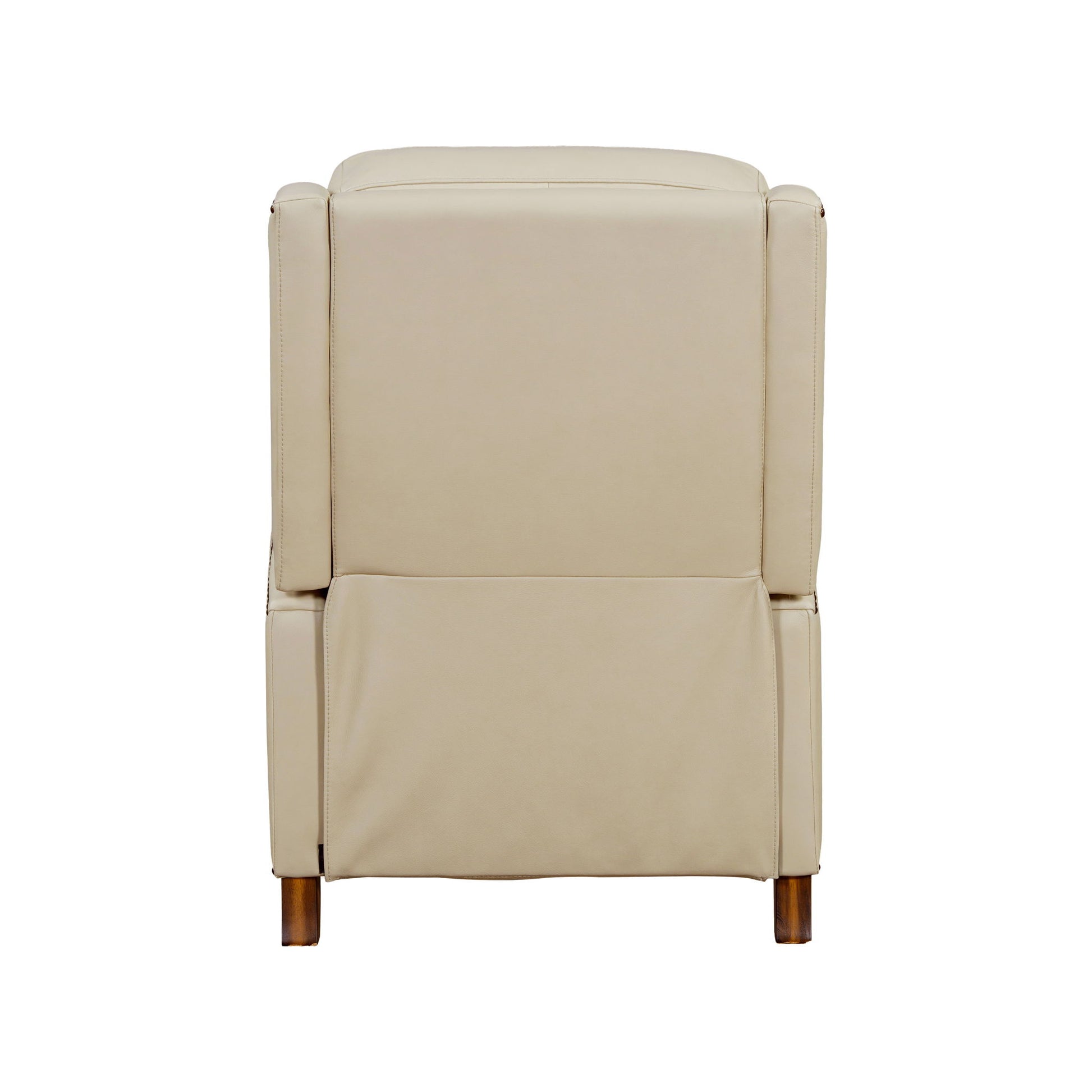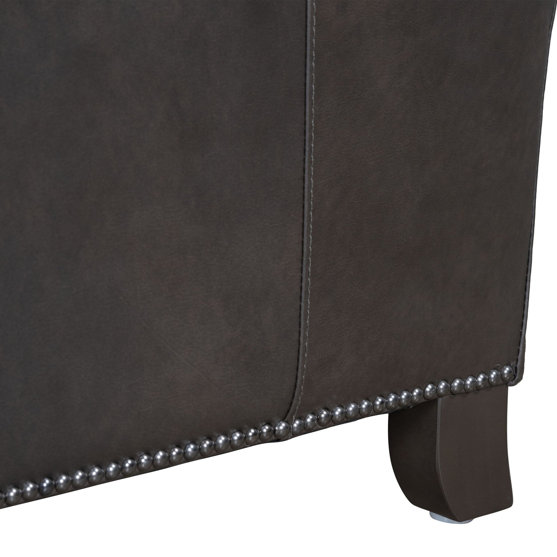 The Vermont pushback recliner offers a luxurious and effortless manual pushback recline feature, allowing you to easily find the most comfortable position for relaxation. It is upholstered in soft leather with custom matching and features decorative nail head stitching detail that adds a touch of elegance. The high-leg design, finished in charcoal wood, not only provides stability but also complements the overall aesthetic.