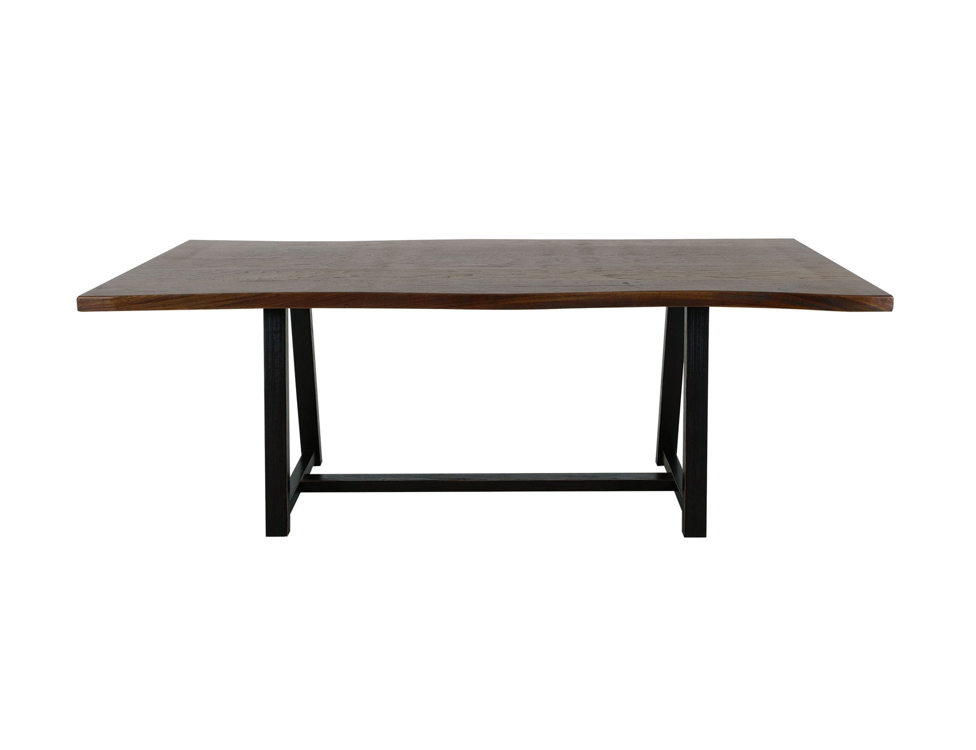Trestle Dining Table. The Walnut Collection Live Edge Dining Table is a timeless piece that combines natural elegance with modern functionality. Made from Parota wood and engineered walnut wood, this table showcases a beauty that transcends trends. Its translucent multi-step lacquer finish in a rich reddish-brown tone highlights the natural beauty and grain of the wood. The live edge on the tabletop adds a rustic and organic appearance, while the sturdy wooden base provides stability and a sleek, modern look. This dining table is a stunning centerpiece for any dining space, seamlessly blending form and function.