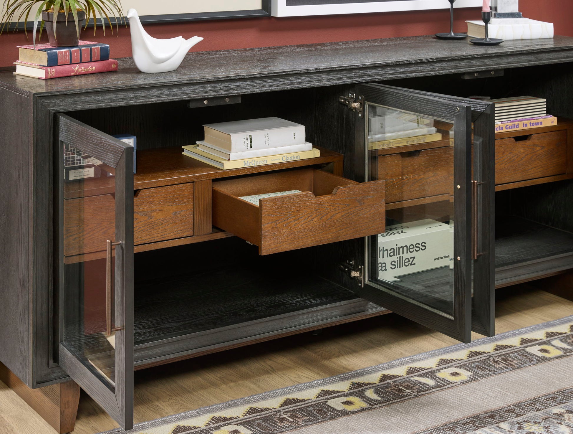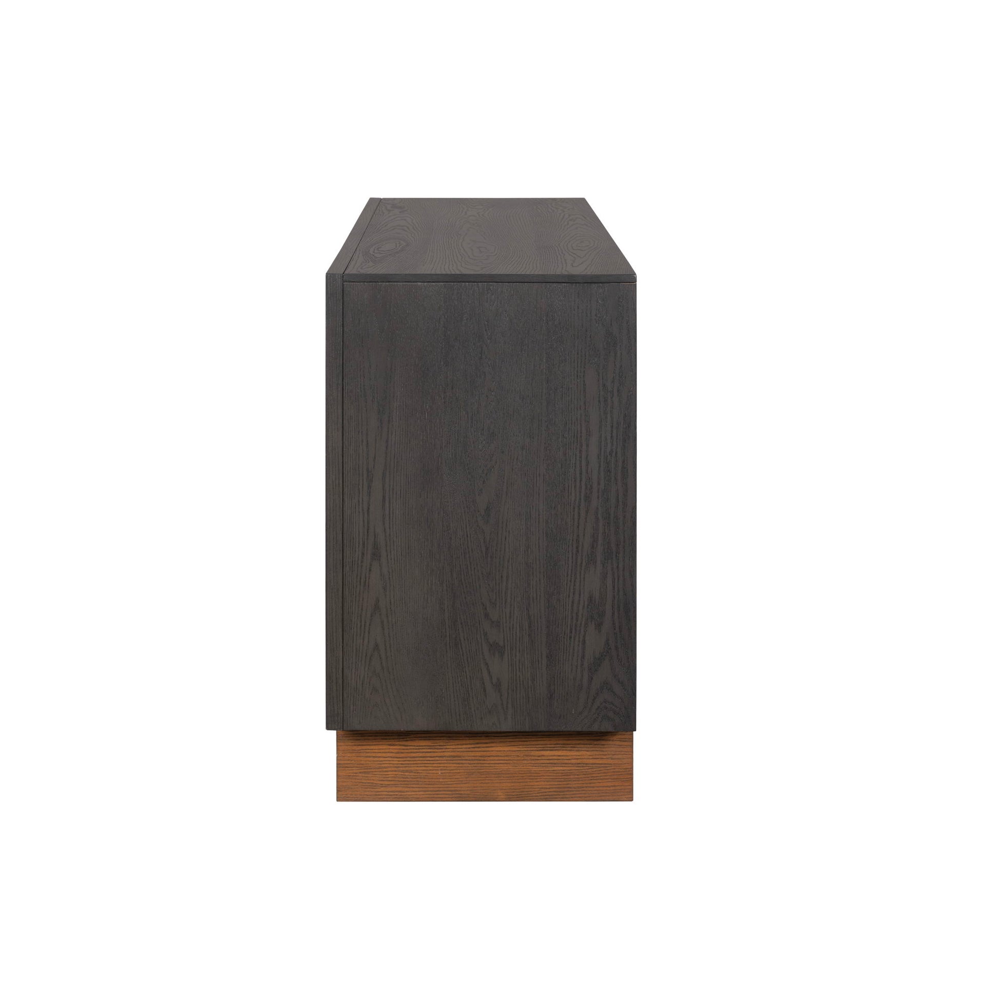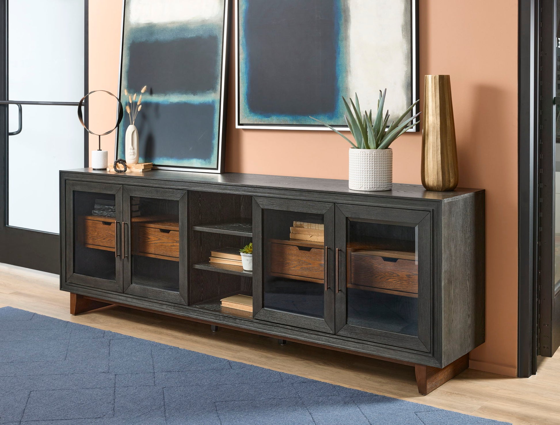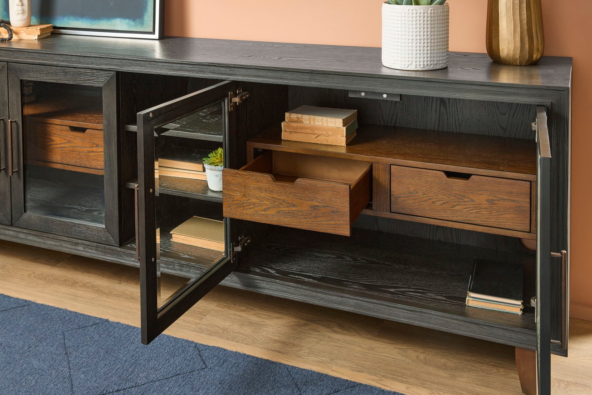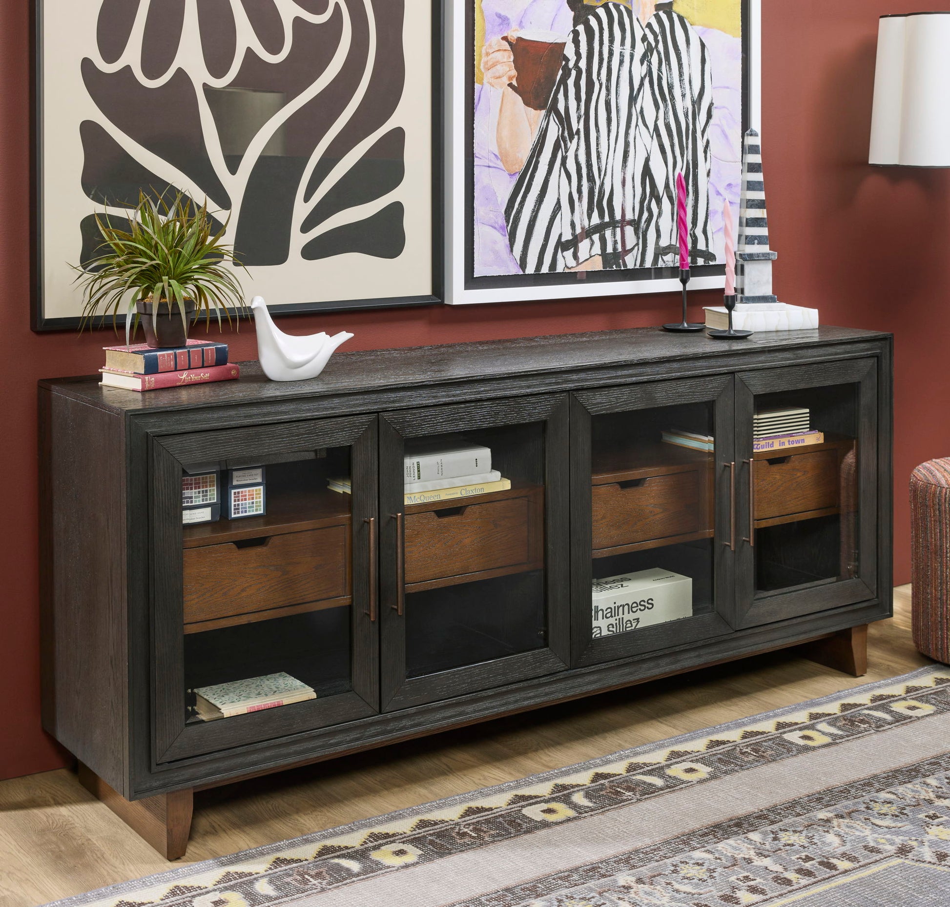 Add effortless style and architectural appeal to your living room with the Waterfall entertainment console. This striking piece features a timeless silhouette defined by clean lines and simple geometric shapes. Meticulously crafted from poplar and rubberwood solids, oak veneers, and a deep ebony finish, this piece is built to be everlasting. The spacious 76” inch top, four storage cabinets with drawers provide ample space for all your entertainment essentials. The graceful namesake waterfall edges give this entertainment console true elegance.