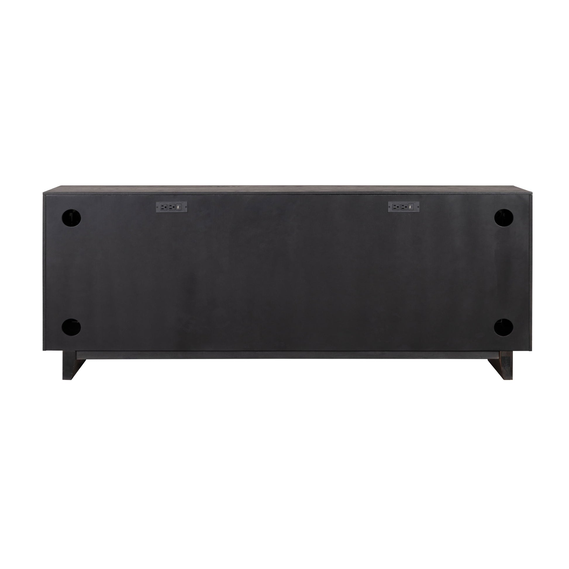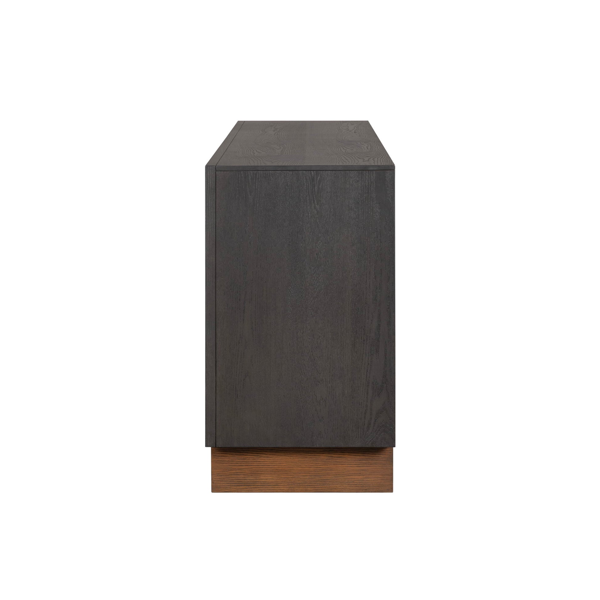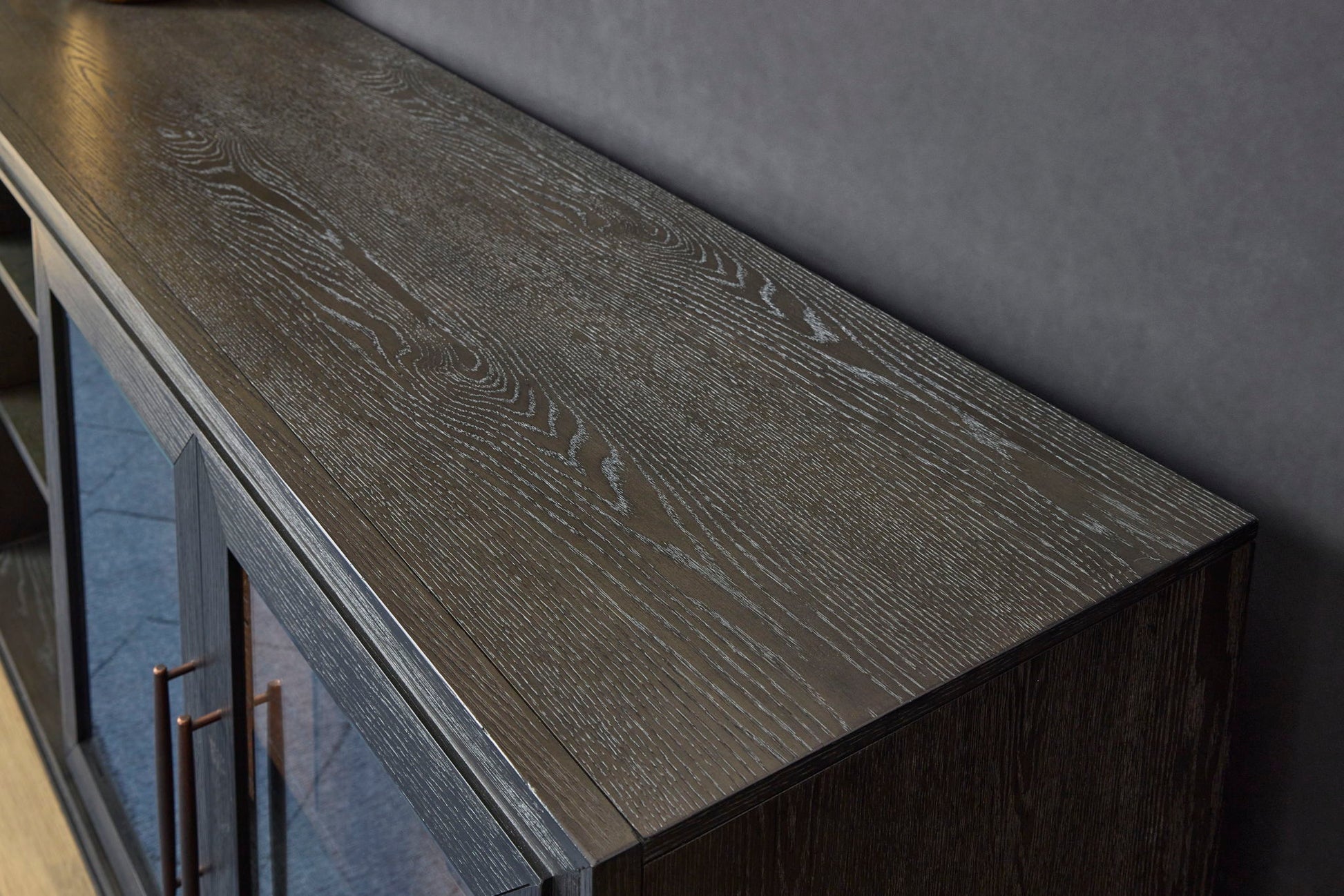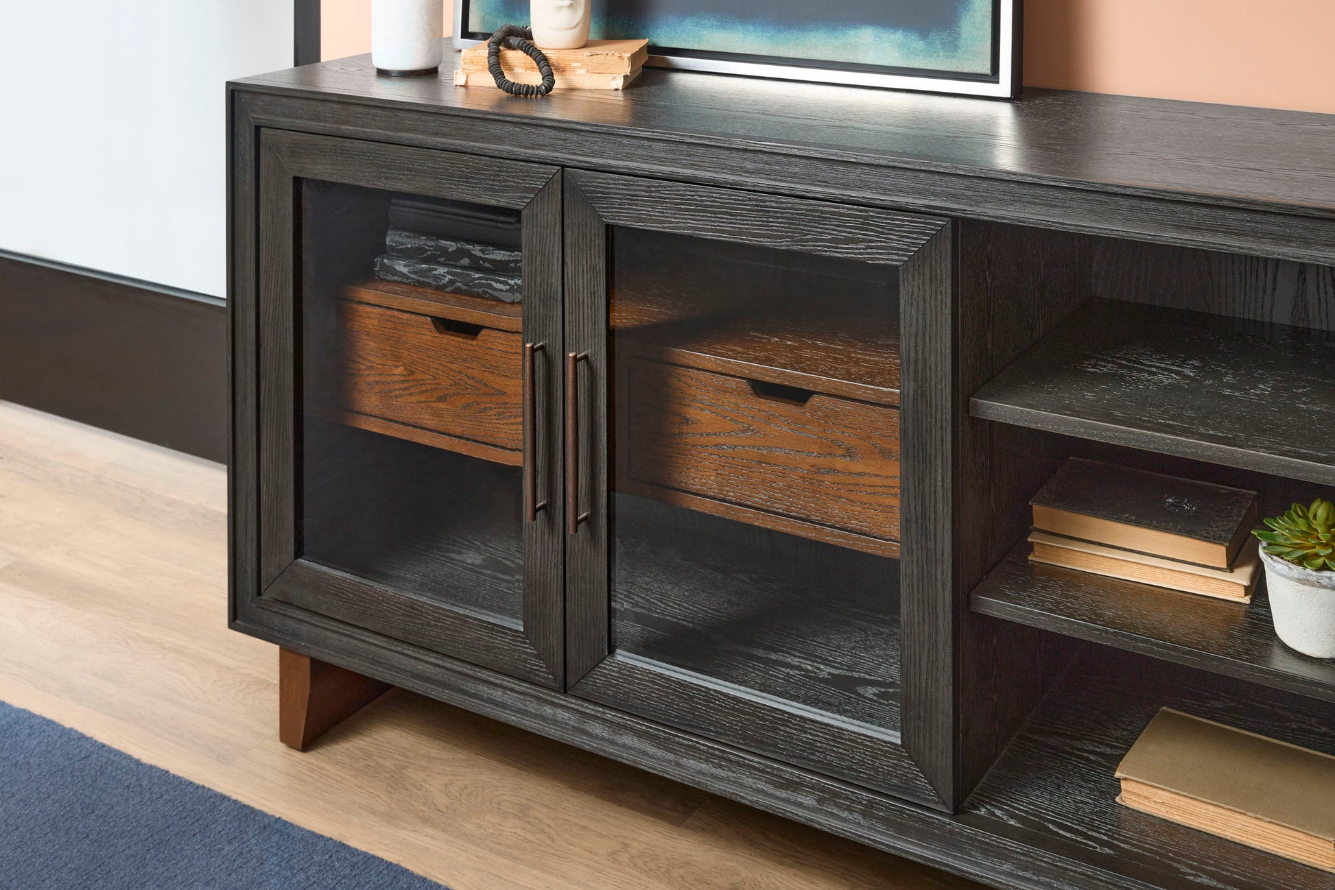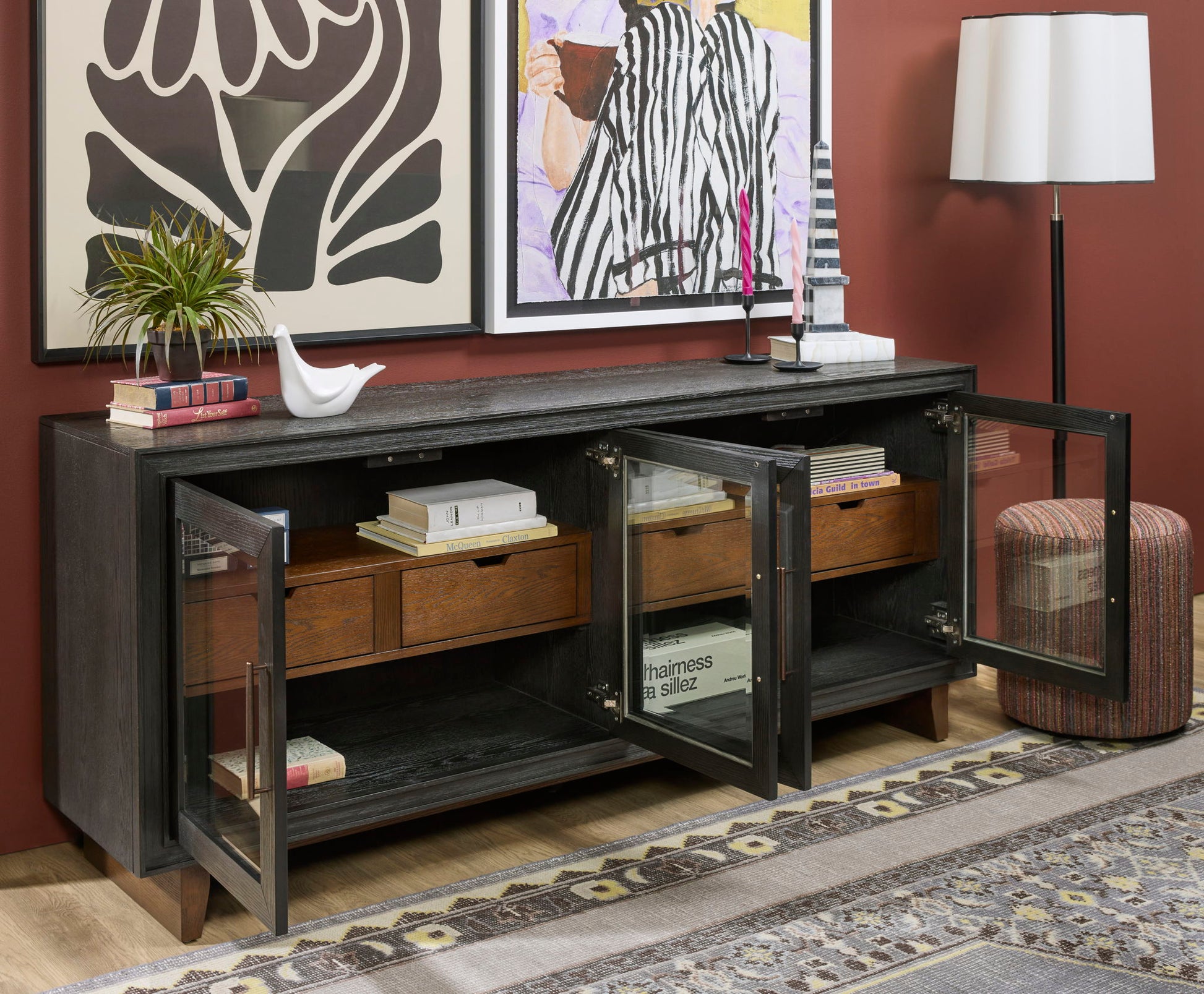 Add effortless style and architectural appeal to your living room with the Waterfall entertainment console. This striking piece features a timeless silhouette defined by clean lines and simple geometric shapes. Meticulously crafted from poplar and rubberwood solids, oak veneers, and a deep ebony finish, this piece is built to be everlasting. The spacious 76” inch top, four storage cabinets with drawers provide ample space for all your entertainment essentials. The graceful namesake waterfall edges give this entertainment console true elegance.