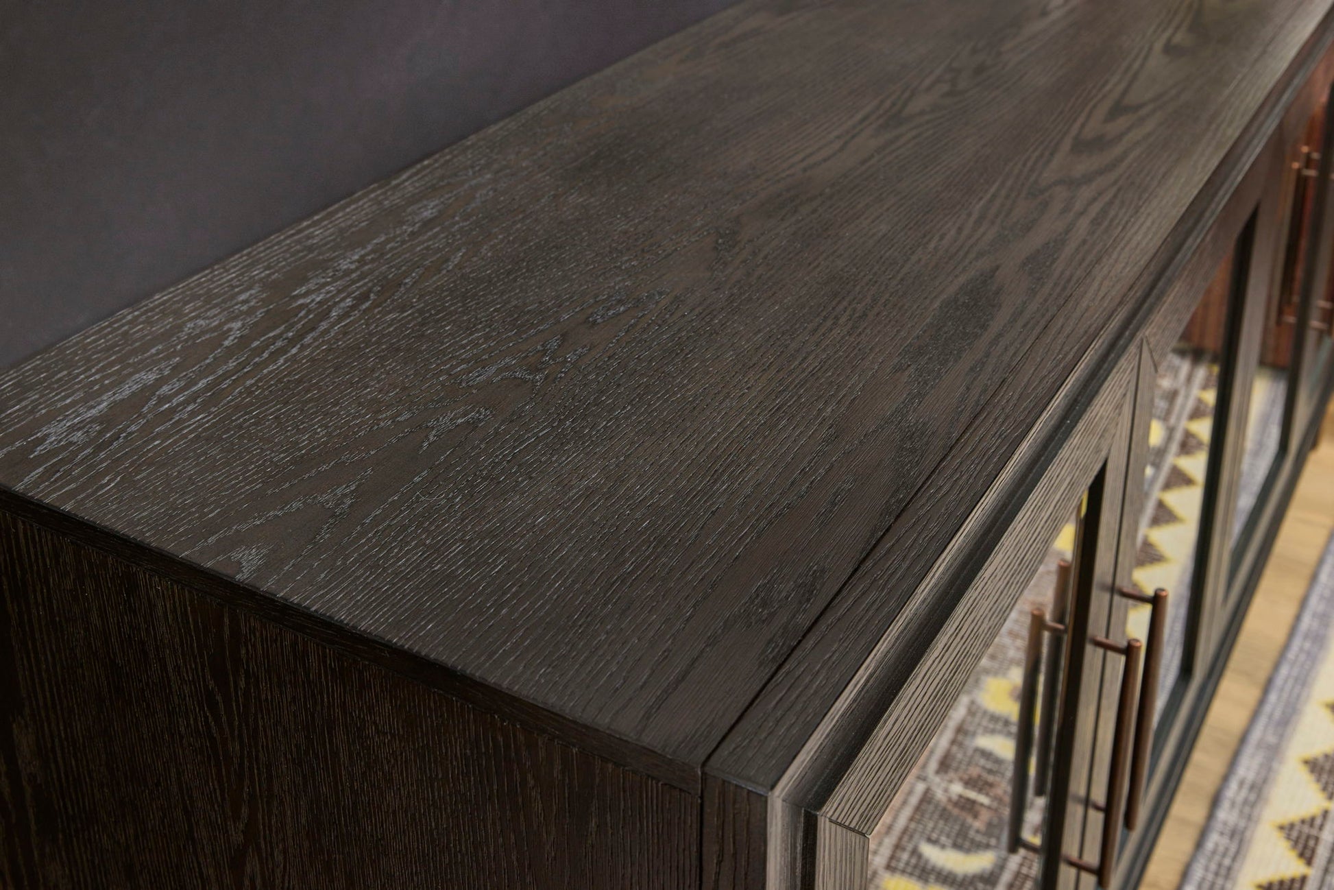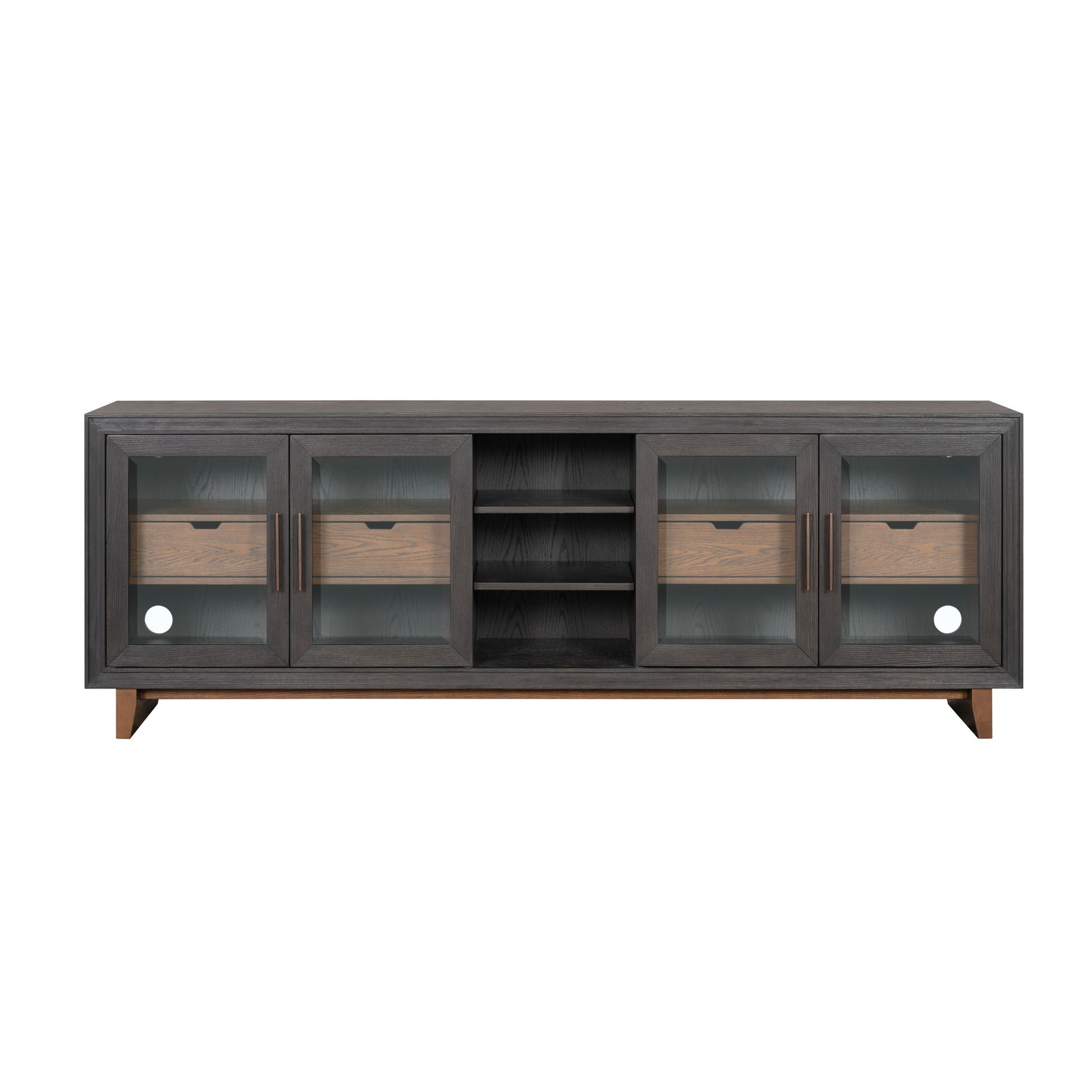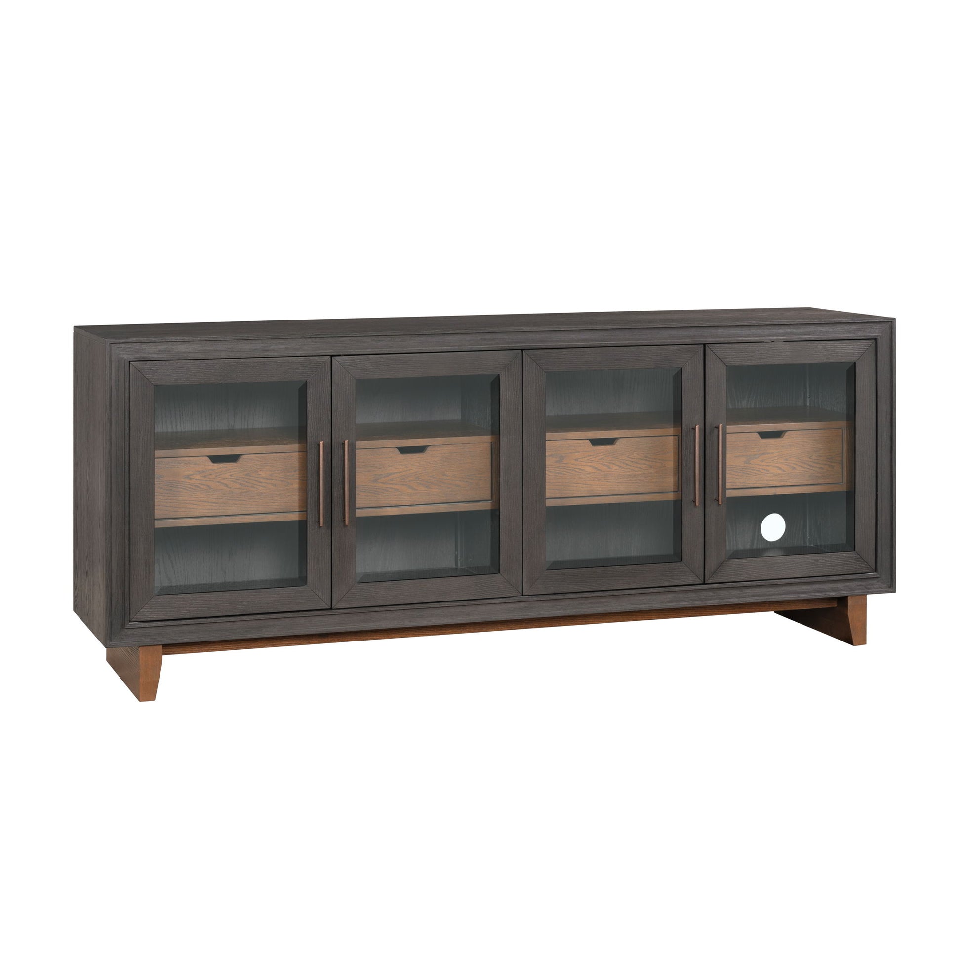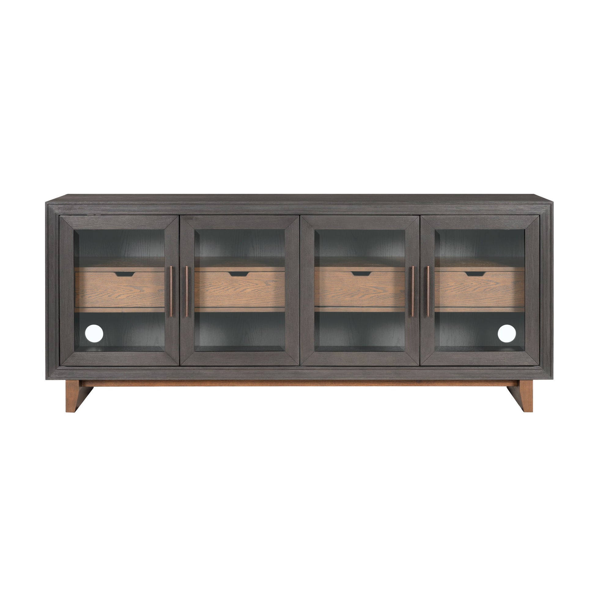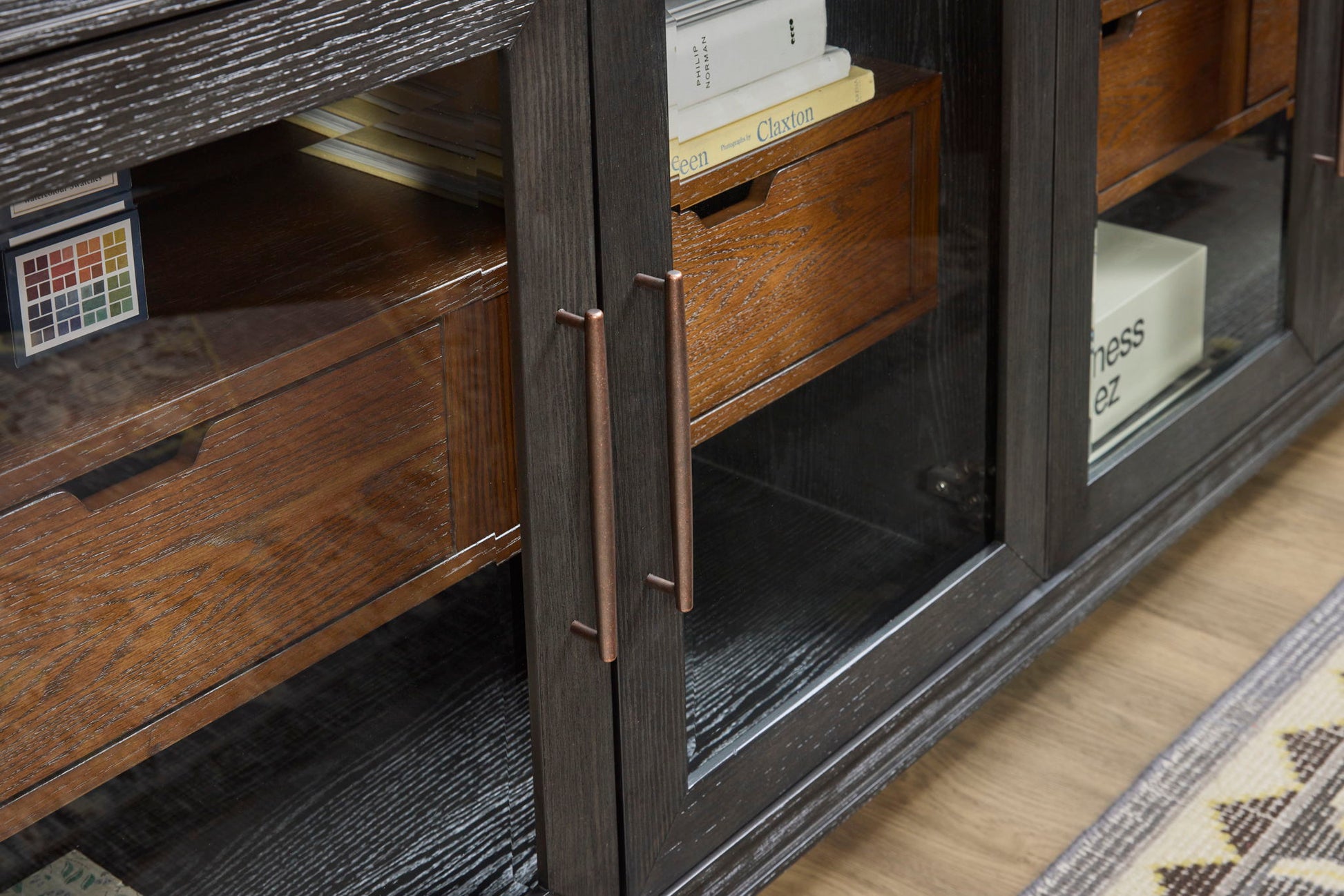 Add effortless style and architectural appeal to your living room with the Waterfall entertainment console. This striking piece features a timeless silhouette defined by clean lines and simple geometric shapes. Meticulously crafted from poplar and rubberwood solids, oak veneers, and a deep ebony finish, this piece is built to be everlasting. The spacious 76” inch top, four storage cabinets with drawers provide ample space for all your entertainment essentials. The graceful namesake waterfall edges give this entertainment console true elegance.