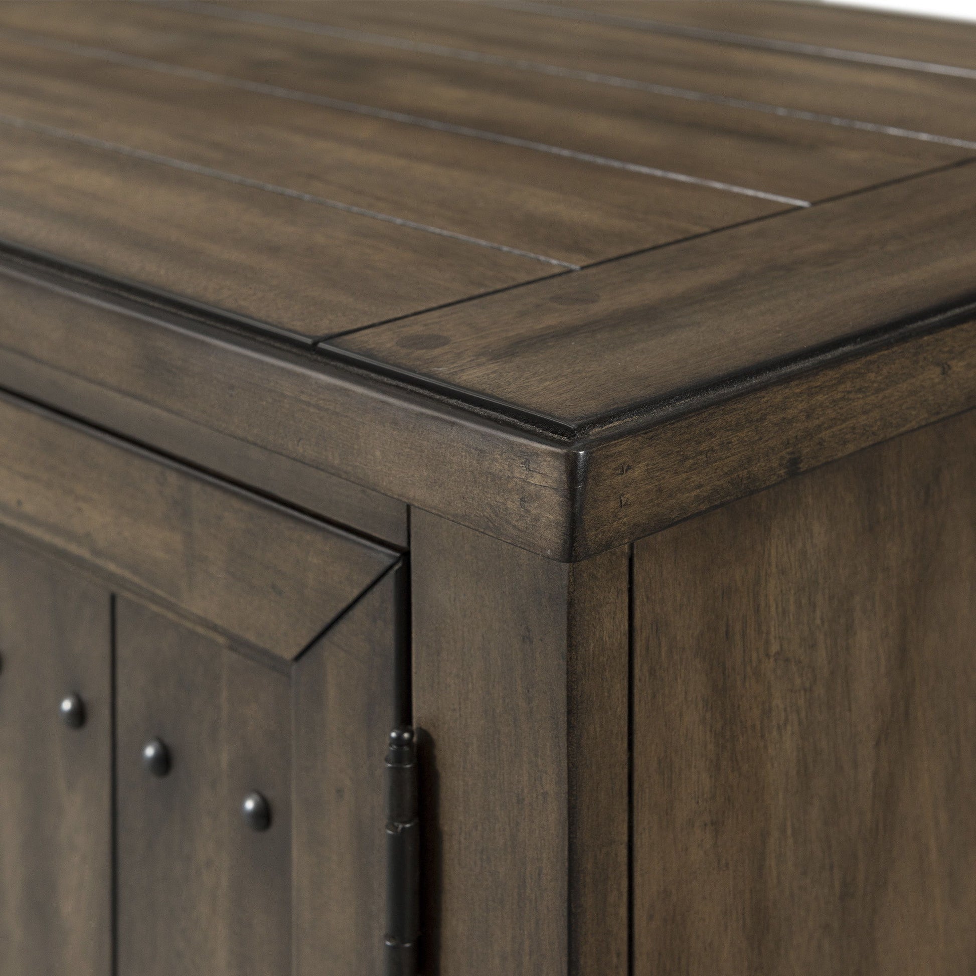 The Whiskey River Living Collection is constructed from birch veneer and select hardwoods and has a clean gunpowder gray finish. Two sizes of TV stands and four accents tables are available to meet your exact living room needs. Black metal bases, decorative nail head accents and metal wire baskets add character and function to this industrial styled collection.