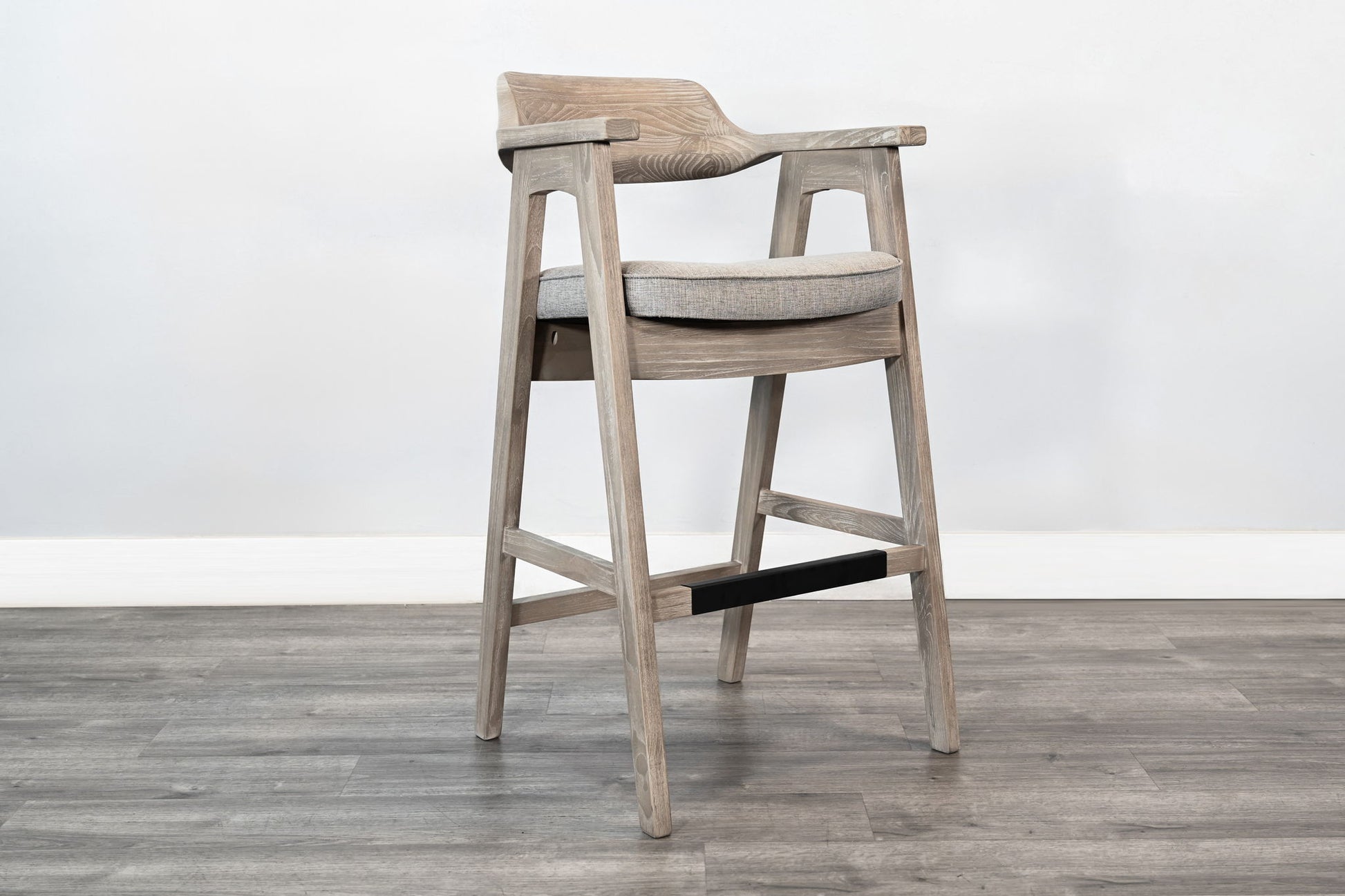 A sleek fusion of form and function, this solid wood bar height arm chair brings mid-century modern charm to any dining or accent space. The sculpted frame and low-profile arms offer a refined silhouette, while the padded seat cushion provides everyday comfort. Crafted from solid wood with visible grain detailing, this piece is perfect for bar height counters or tables.