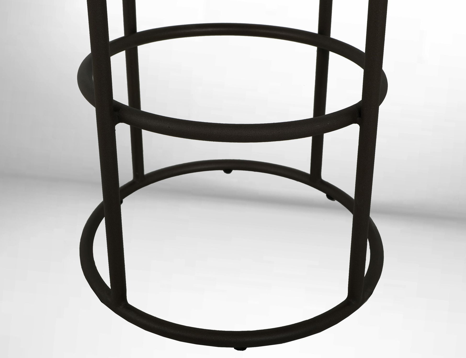 Upholstered Seat & Metal Frame Barstool, 30". The Xel-Ha collection stool beautifully combines industrial and rustic design elements. It has a sturdy metal frame with a circular base and footrest supports, providing stability and durability. The seat is round and cushioned for comfort, while the backrest features an eye-catching wooden panel, adding warmth and character to the overall design. This versatile stool is ideal for modern, industrial, or eclectic spaces, seamlessly blending style and functionality.