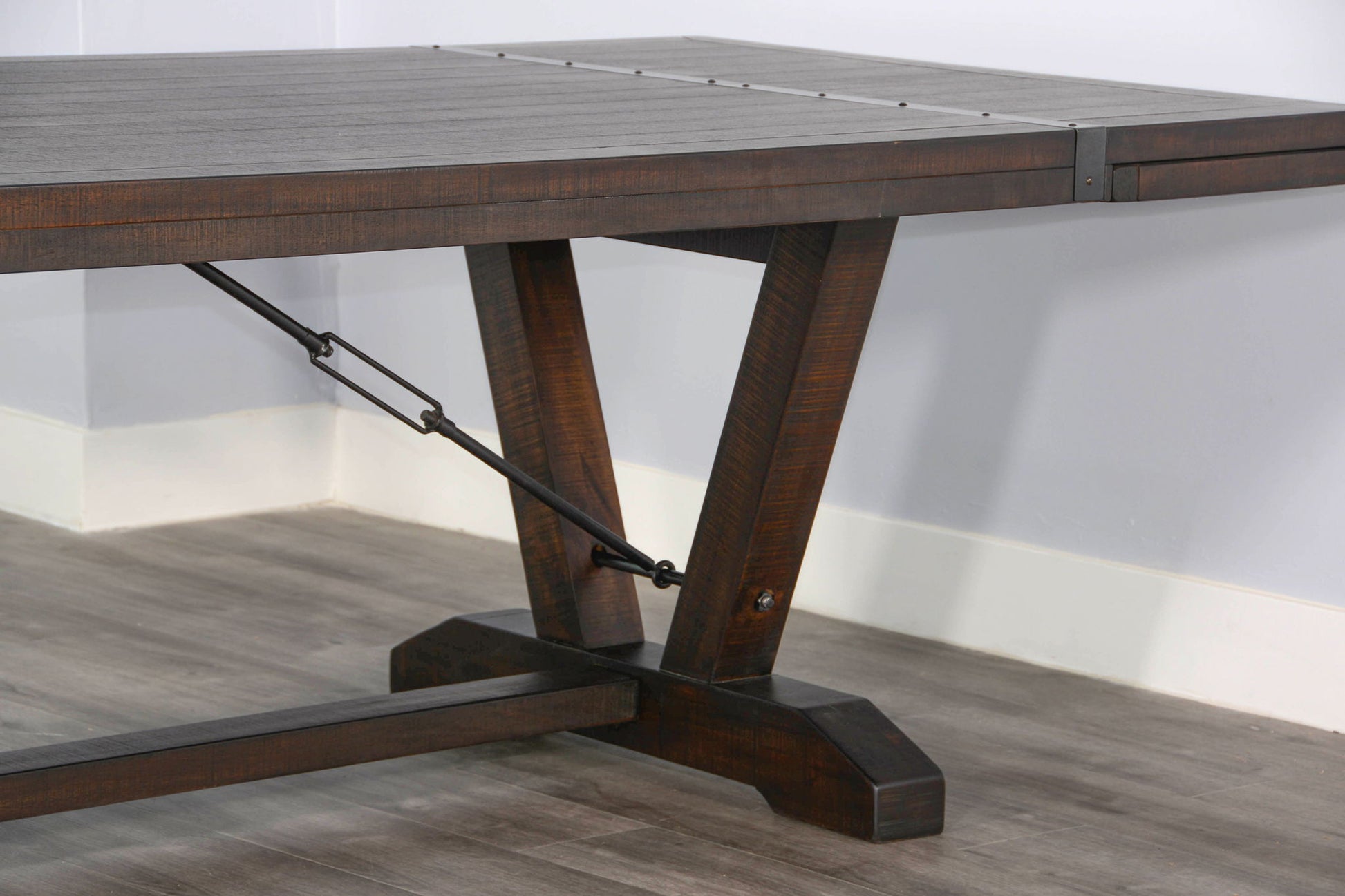We've elevated your dining experience with our expansive dining table, equipped with two 16" leaves, allowing it to comfortably seat up to 10 people when fully extended. The turnbuckle base and solid wood construction, finished in a rich tone, showcase distinctive features that set this table apart. Adding a touch of on-trend style, a subtle industrial element on the tabletop enhances the overall aesthetic, creating a dining piece we truly adore.