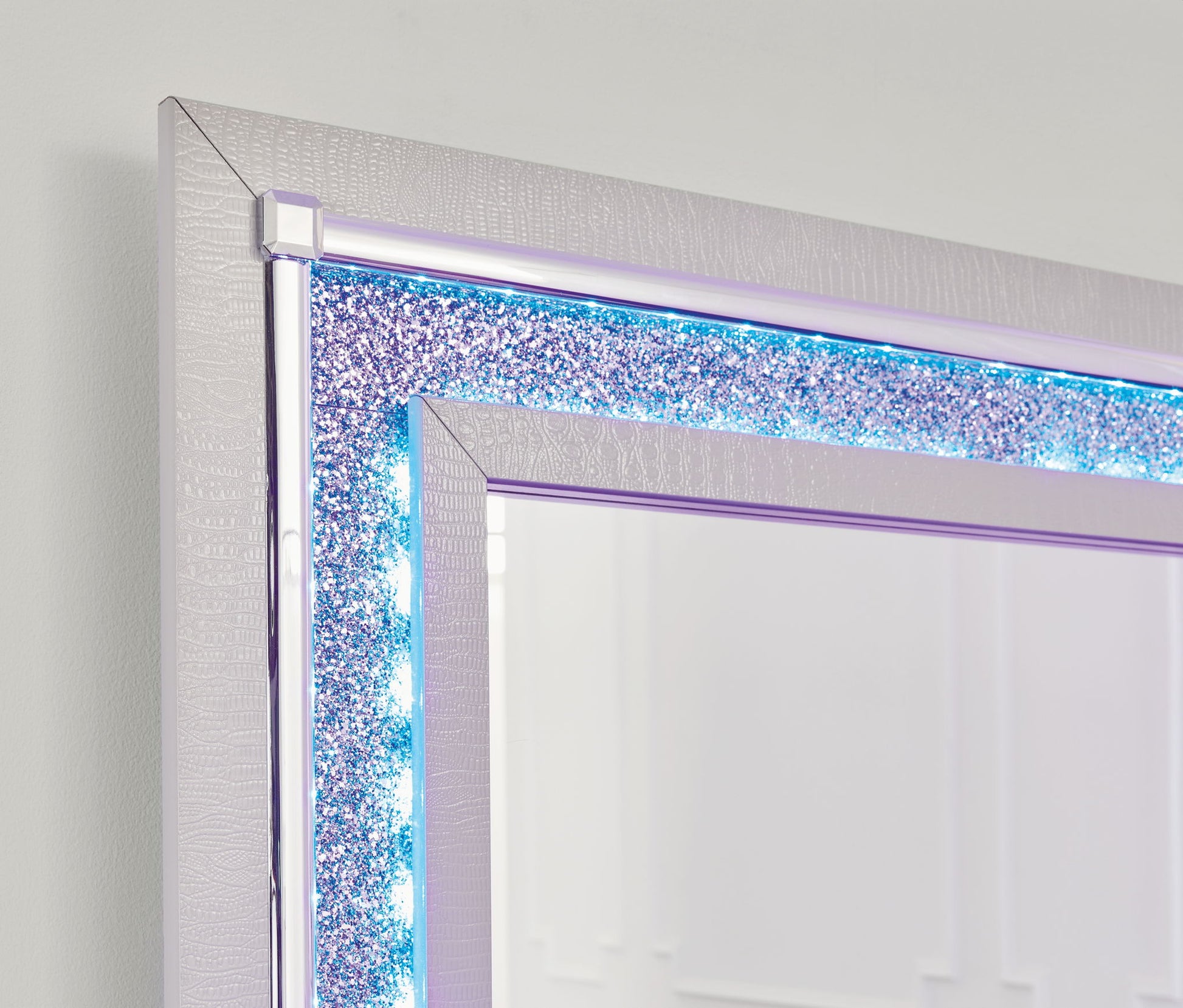 Bright, bold luxury. This dresser with mirror dazzles with its attention to detail. Your love of glamorous style is reflected in its all-over faux gator in a metallic finish, exquisitely paired with faceted chrome-tone details. Complete with LED lighting around the mirror, it inspires you to live luxuriously every day—whether dressing up to go out or dressing down to stay in.